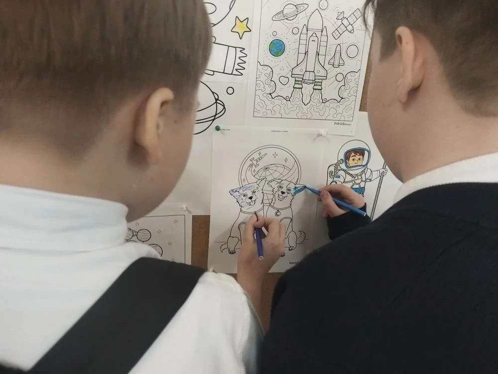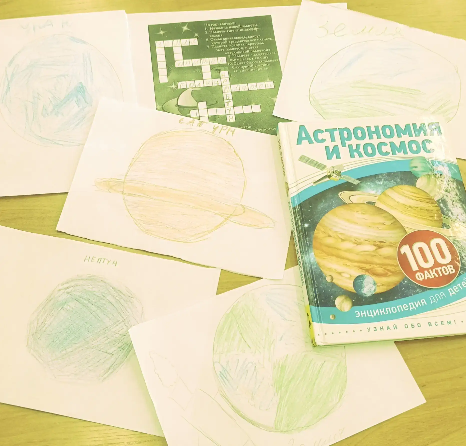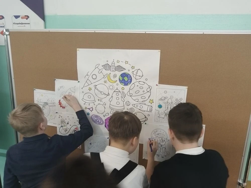 ❇️В рекреации была организована целая «Космическая улица», прогулявшись по которой можно было познакомиться с книгами о космосе, проявить свои художественные таланты и раскрасить «космическую» картину, посмотреть работы ребят, которые нарисовали чудо-планеты и побывать на переменах в импровизированном кинозале, где транслировался мультфильм «Тайна третьей планеты».