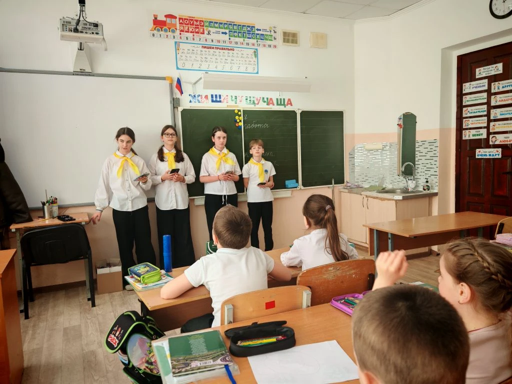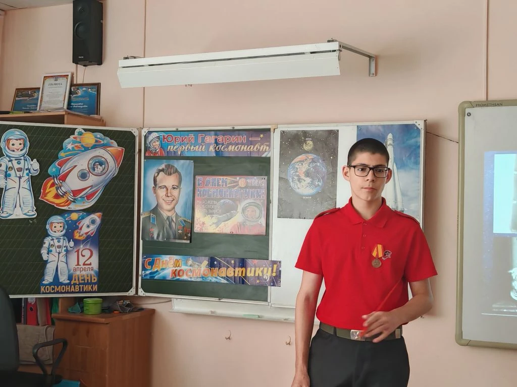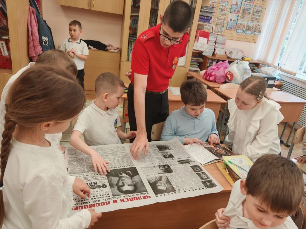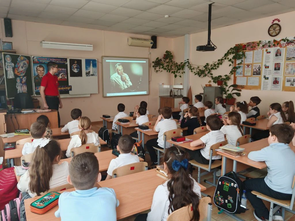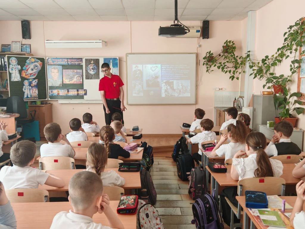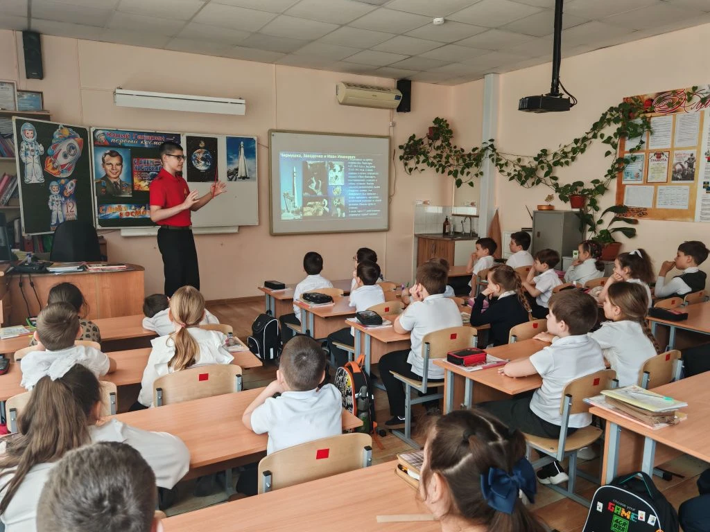 Ко Дню космонавтики ученик 8Г класса МБОУ СОШ №4 им.В.М.Евскина, активист движения «Первые» и большой знаток истории Алексей Святов провёл для учеников 1А класса настоящий урок мужества. Тема встречи — *«Первые в космосе»* — вызвала живой интерес у школьников.