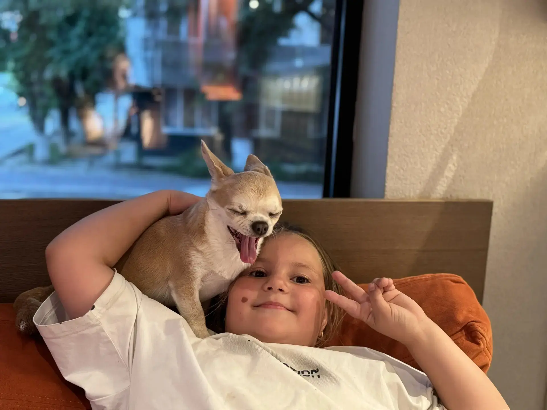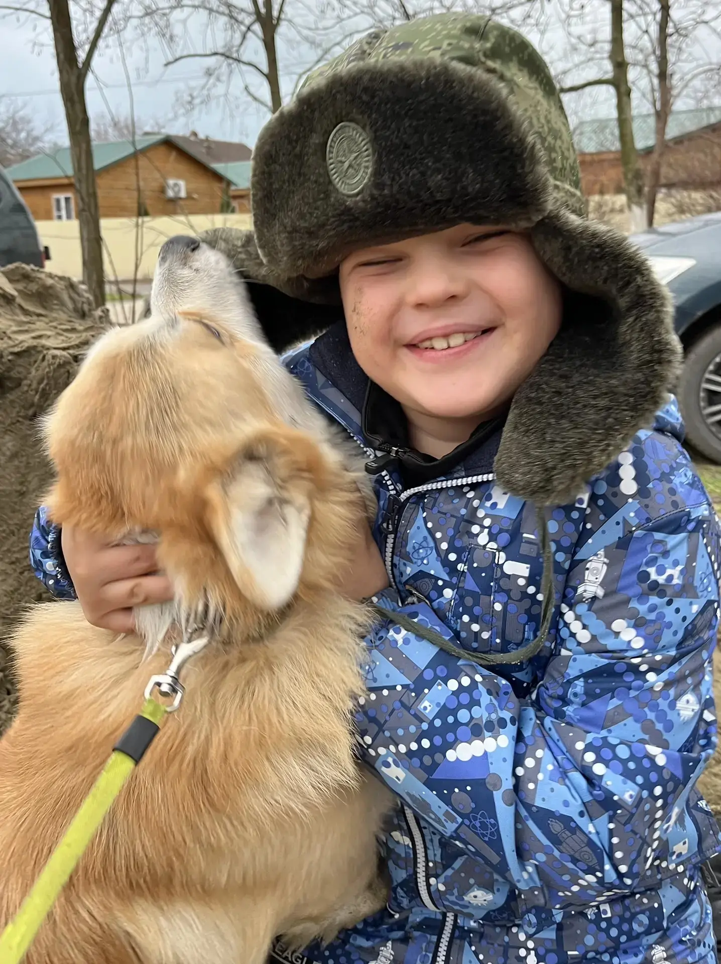 Варанкин Иван 2Б класс, обнимает свою собаку корги Чапу