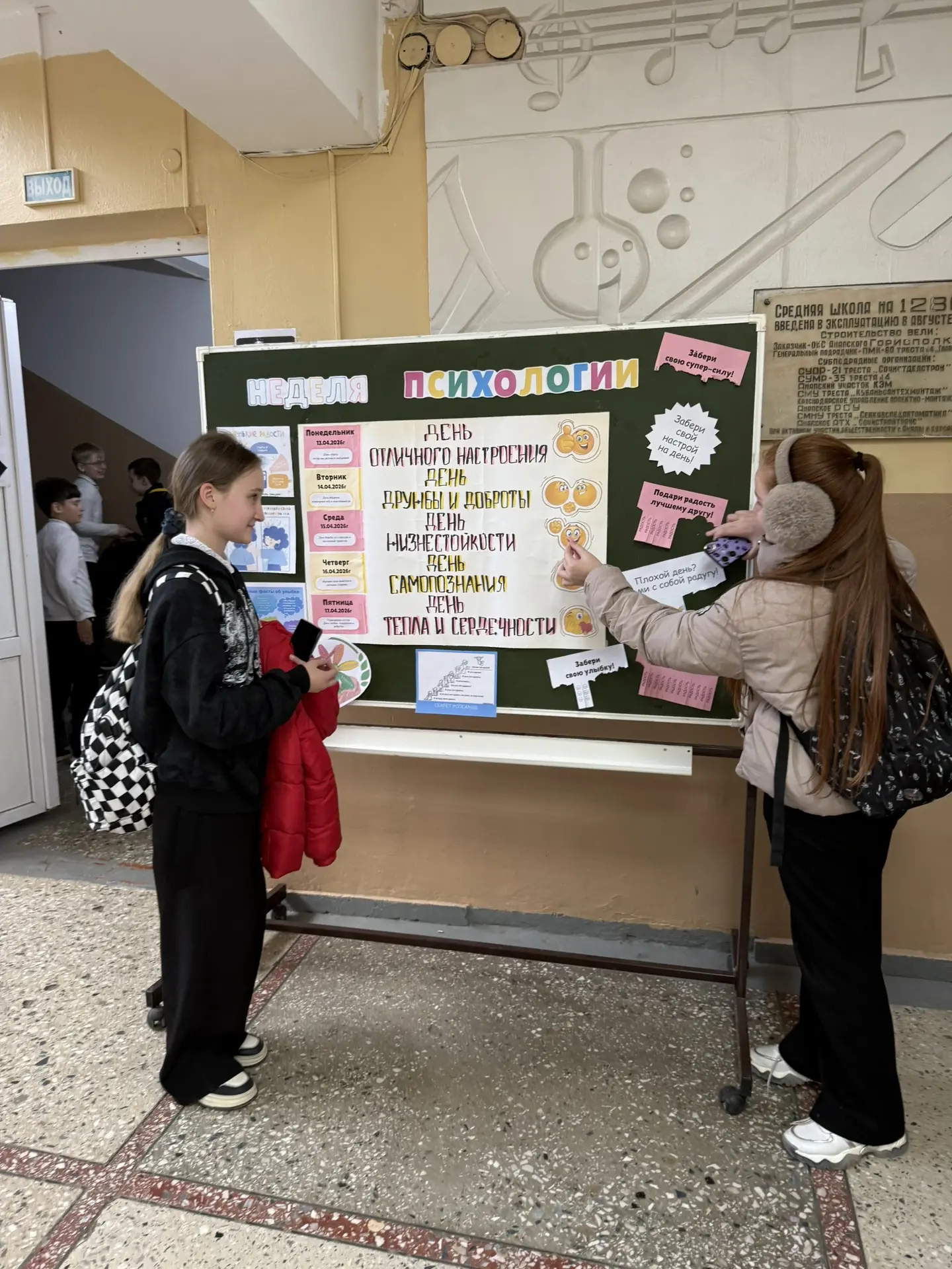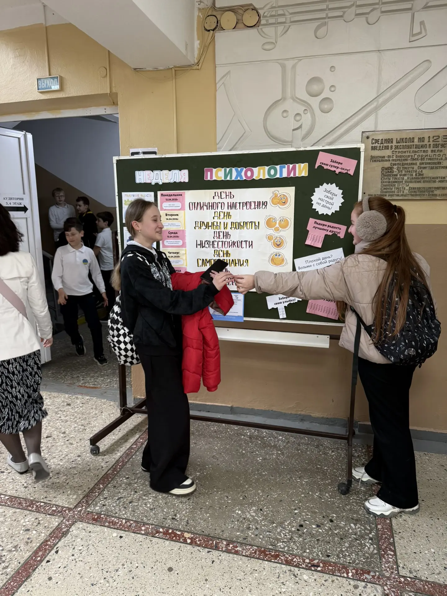 На этой неделе в нашей школе прошла «Неделя психологии» — педагоги работали у яркого стенда, где каждый мог остановиться, поговорить и выбрать добрые пожелания в формате стикеров. Психологи и классные руководители проводили короткие беседы, мини‑тренинги и игровые упражнения, поддерживали детей и объясняли, как заботиться о своём настроении. Стикеры с тёплыми фразами ребята брали с собой в тетради или на пеналы — маленькое напоминание о заботе и дружбе на весь учебный день. Благодарим всех участников за неформальную, тёплую атмосферу и ценную работу с эмоциональным благополучием школьников.