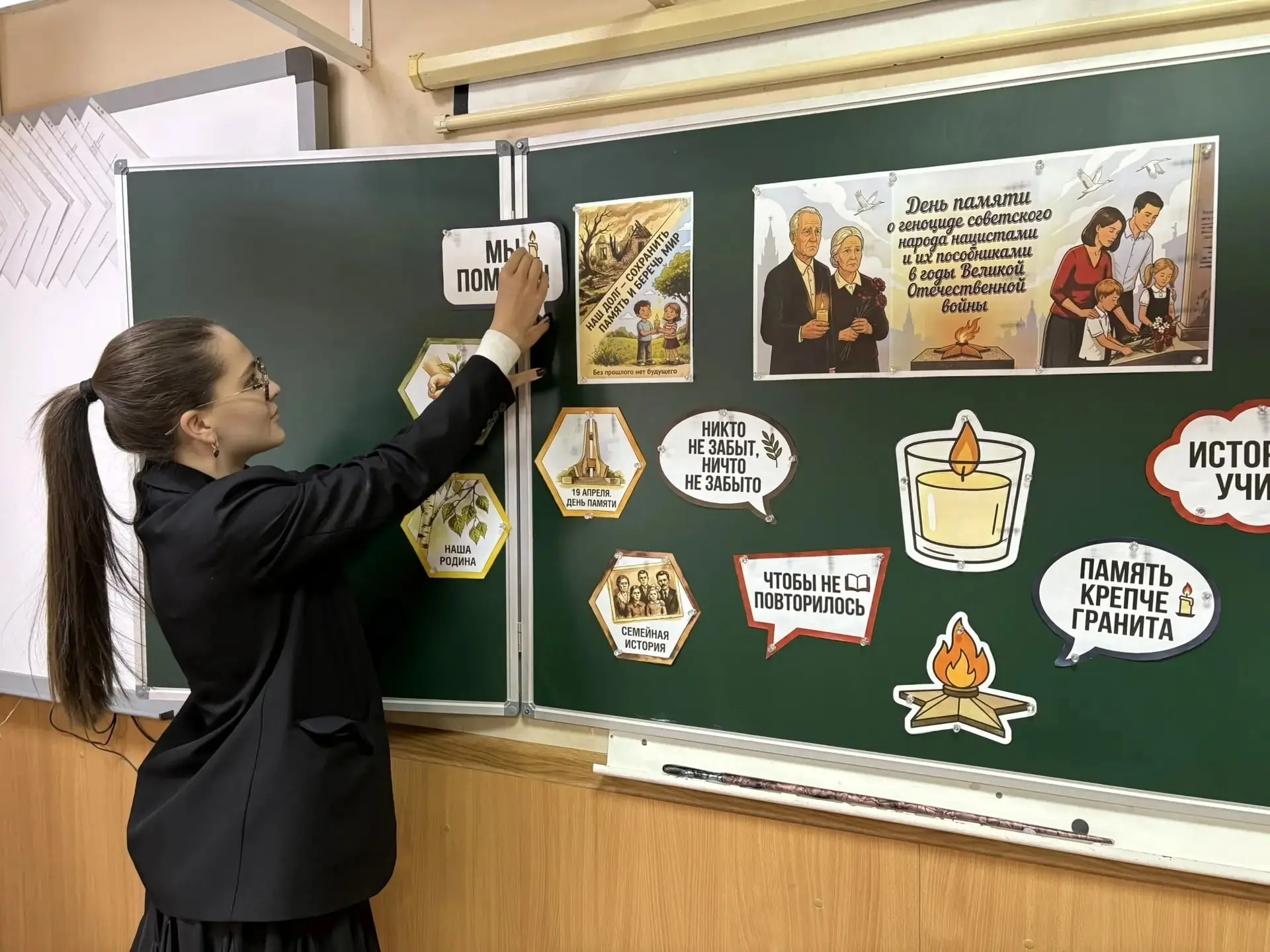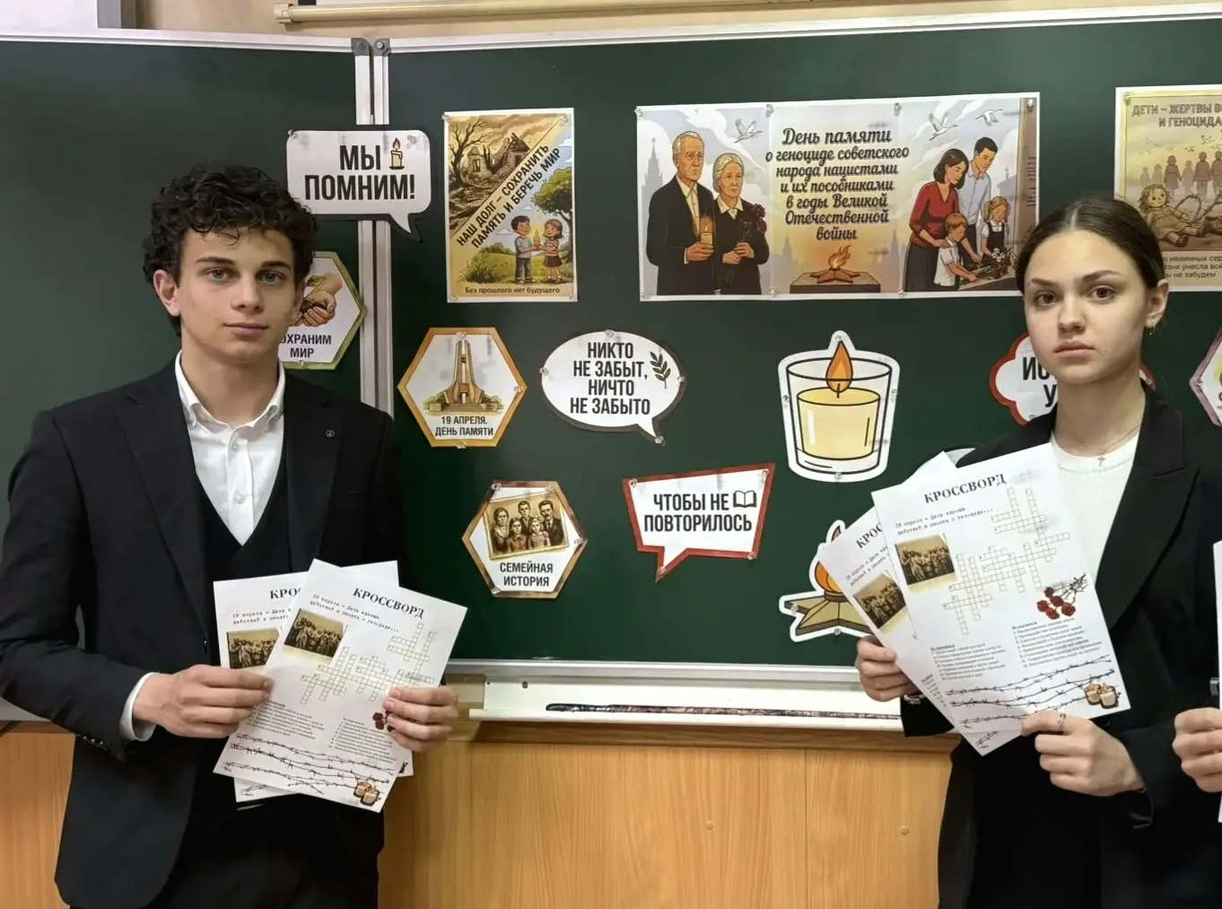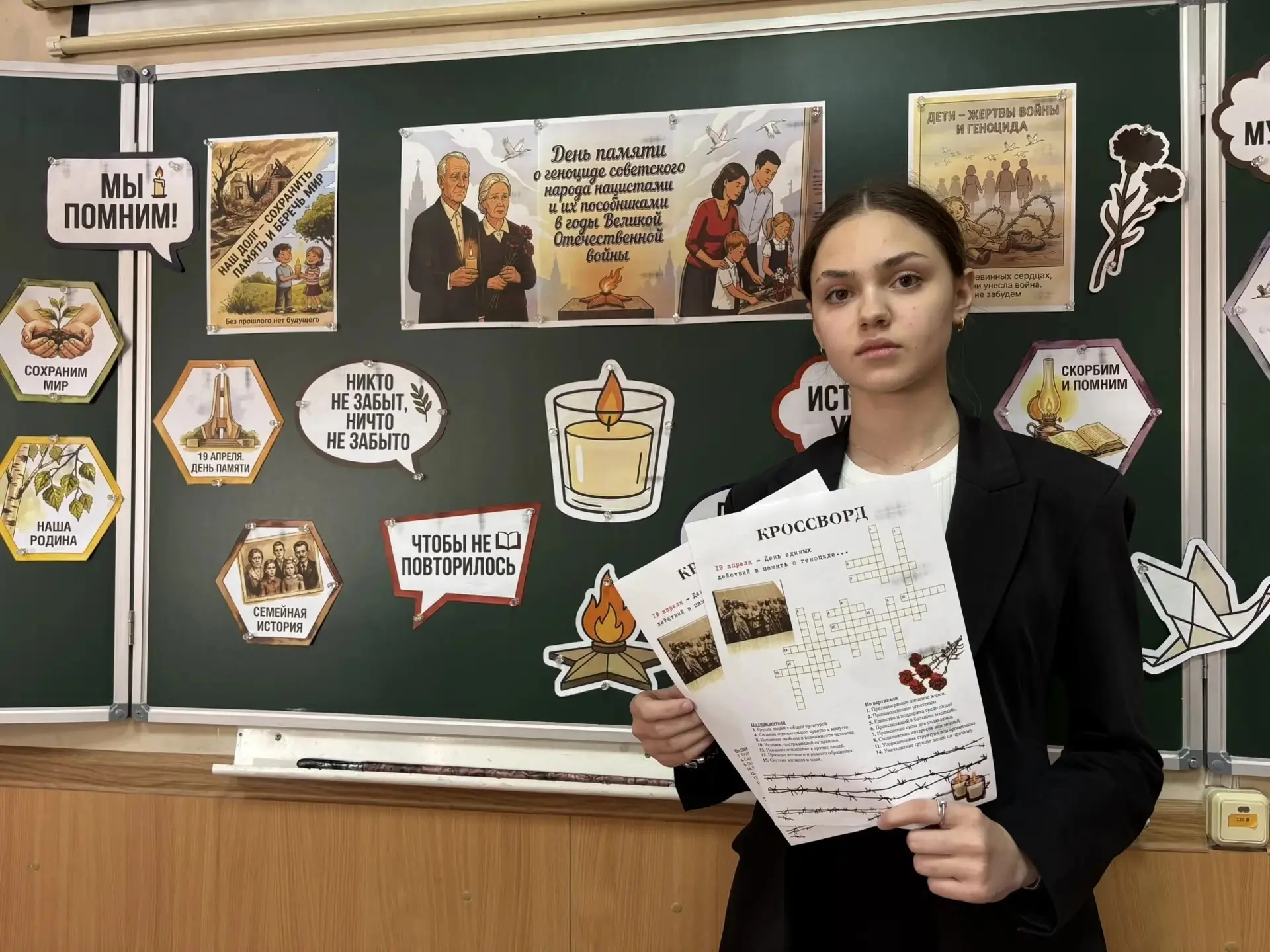 19 апреля — День памяти о геноциде советского народа нацистами в годы Великой Отечественной войны. День Памяти- важный для каждого из нас. Чтить память о прошлом и усваивать его уроки — значит уважать историю, ценить мир и строить будущее без повторения ошибок. Это помогает ребятам становиться ответственными гражданами и сохранять связь поколений. В гимназии прошли классные часы, посвящённые 19 апреля — Дню памяти. Активисты гимназии совместно с активом «Движения Первых» оформили тематический уголок, подготовили раздаточный материал и кроссворды, посвящённые этому дню.