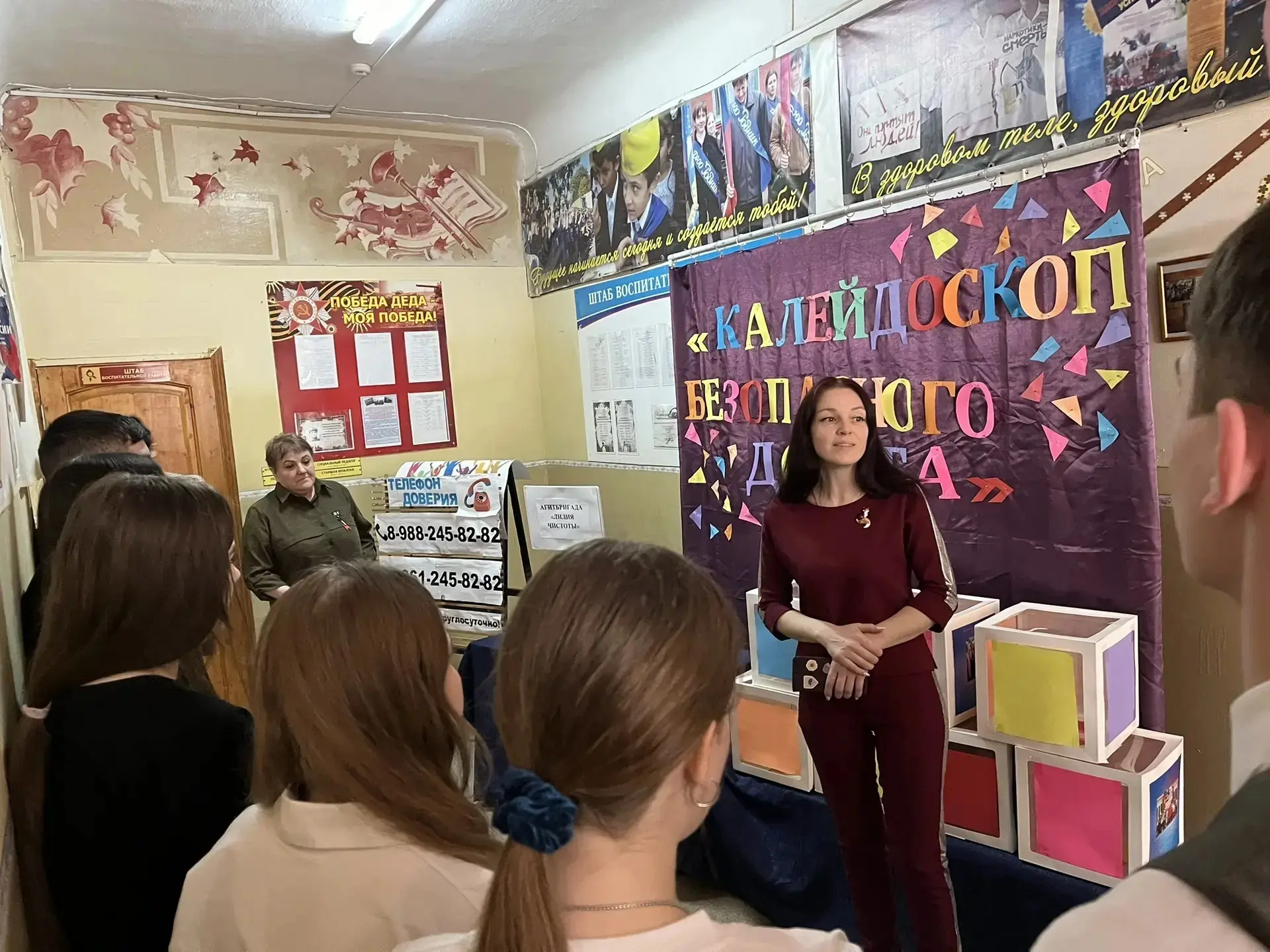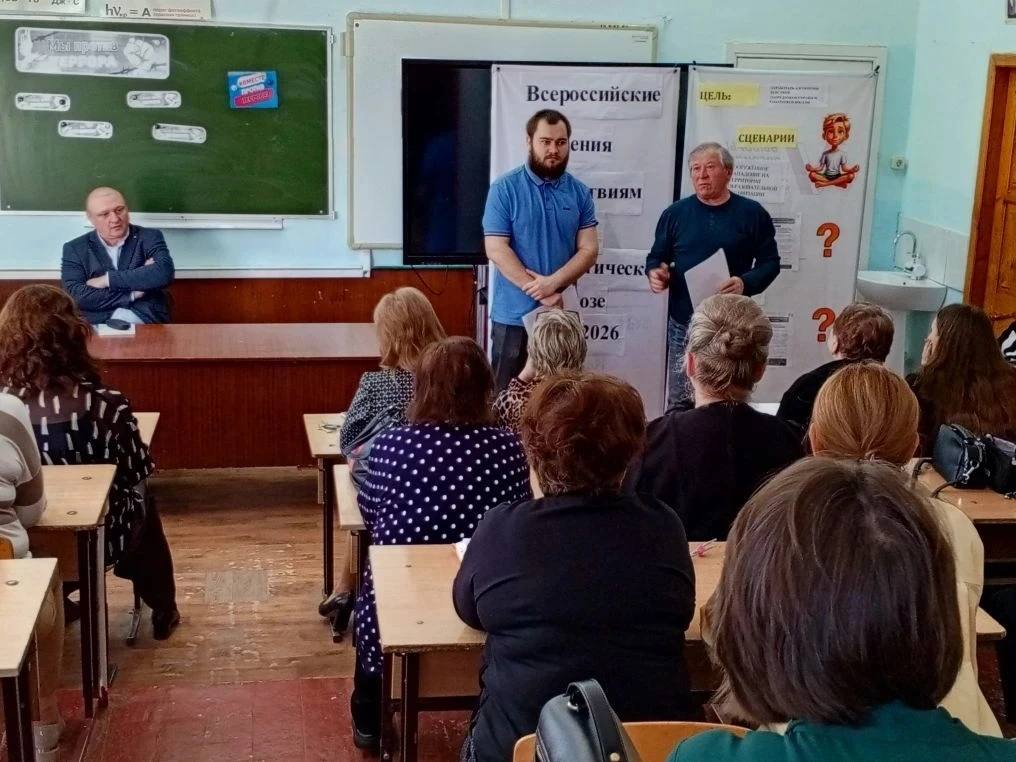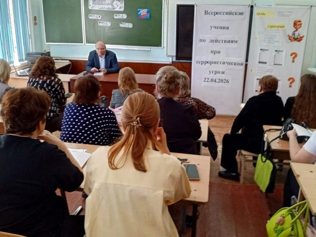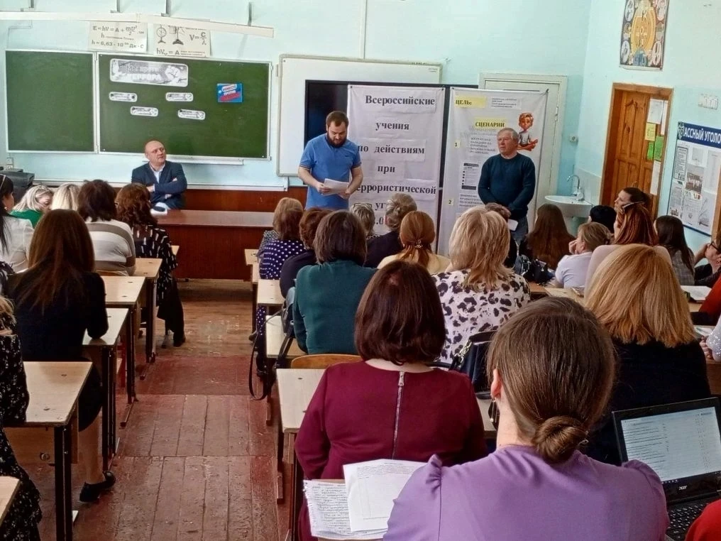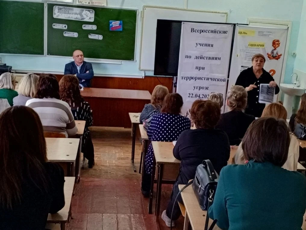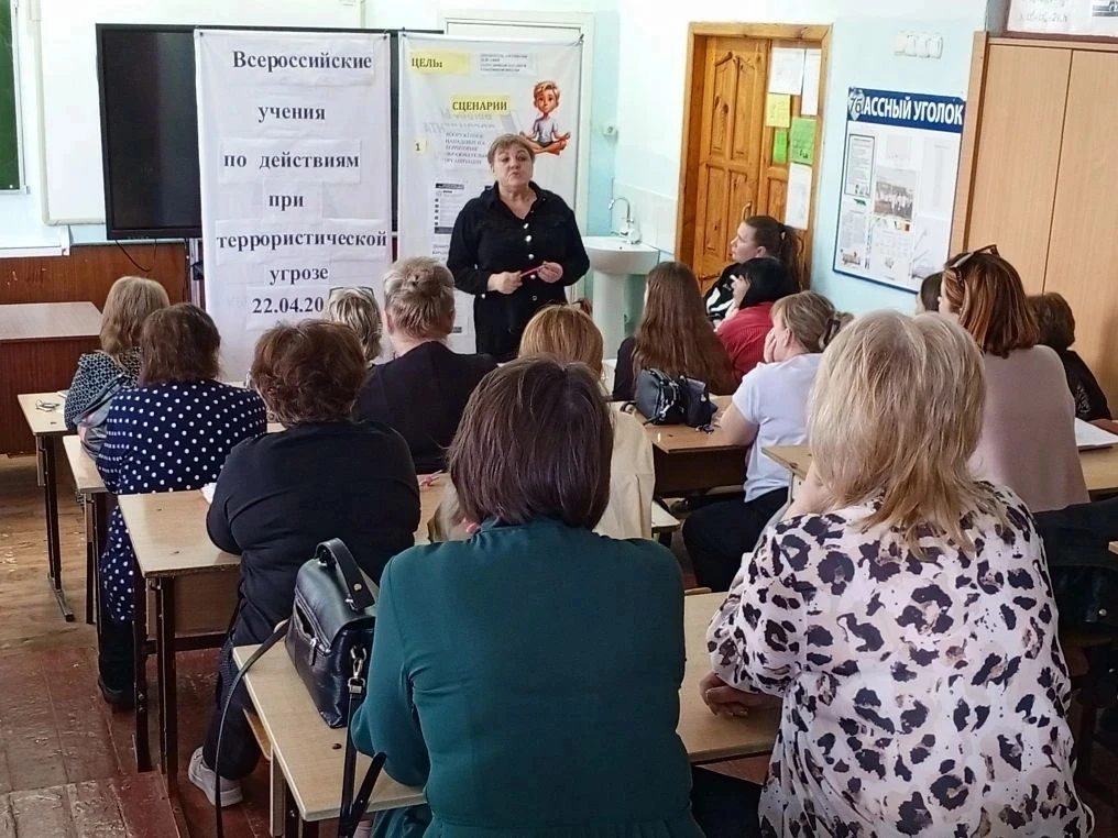 В рамках Всероссийских учений по противодействию терроризму 16.04 в школе прошло совещание коллектива "Алгоритмы действий при террористических угрозах", на котором директор школы Колбасников А. В., и. о. заместителя директора по ВР Комарова И. В., преподаватель ОБЗР Шакун В. О., учитель технологии Гармашов А.Н. напомнили присутствующим об алгоритмах поведения при вооруженном нападении на школу, при опасности беспилотника, в случае угрозы взрыва здания. Присутствующим были выданы памятки "Куда сообщить о террористической угрозе", " Правила безопасного поведения в случае угрозы взрыва здания", "Агоритм действий при опасности беспилотника", " Рекомендации при захвате заложников".