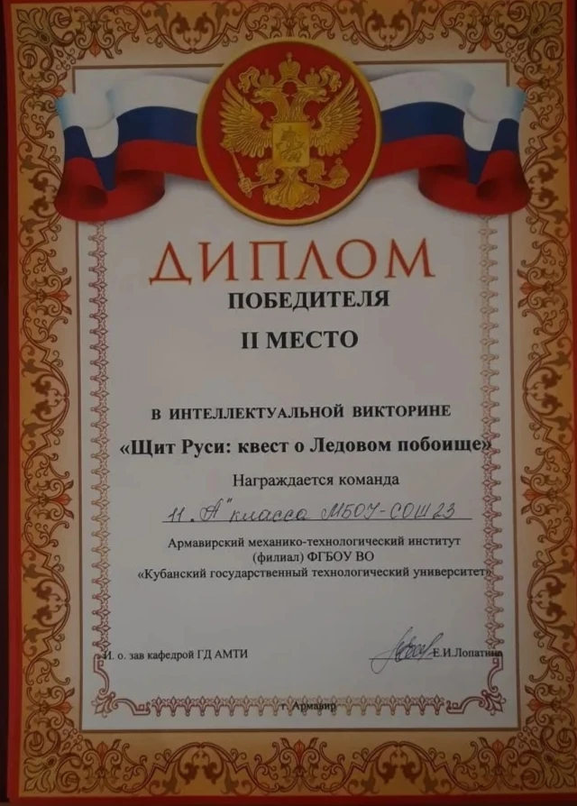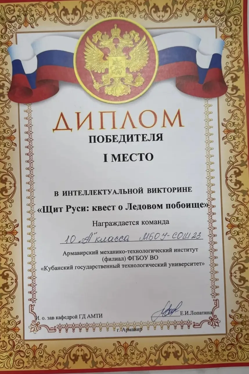 🎓 Сегодня учащиеся 9-х, 10А и 11А классов приняли участие в увлекательной интеллектуальной викторине, посвящённой Дню воинской славы России. Мероприятие прошло на базе ФГБОУ КГТУ «Армавирский механико-технологический институт».