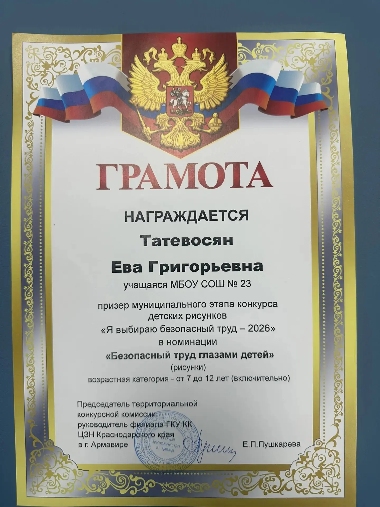 Ева заняла почётное 3 место в муниципальном этапе конкурса детских рисунков «Я выбираю безопасный труд — 2026» в номинации «Безопасный труд глазами детей» (возрастная категория 7–12 лет).