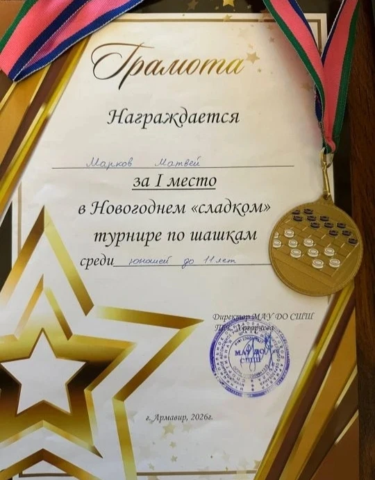 Поздравляем учащегося 3Д класса — Маркова Матвея, занявшего заслуженное 1 место🥇🏆 в новогоднем сладком турнире по шашкам среди юношей муниципального образования города Армавир в возрастной категории до 11 лет! Молодец!👍👍👍 Поздравляем! 🎉👏👏👏