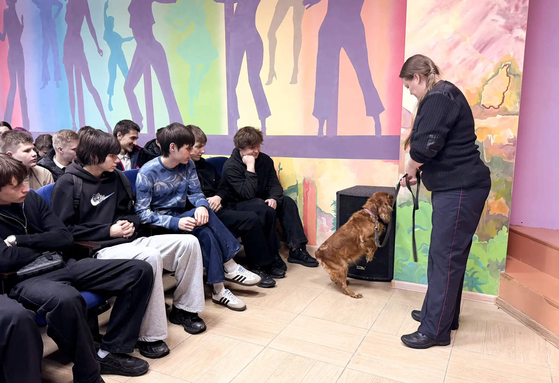 🐕 Большой восторг у студентов вызвала демонстрация работы кинолога и служебной собаки. Инспектор-кинолог Анастасия Плешкова объяснила, какие породы собак лучше всего подходят для поисковой работы и как животные помогают в поиске людей.