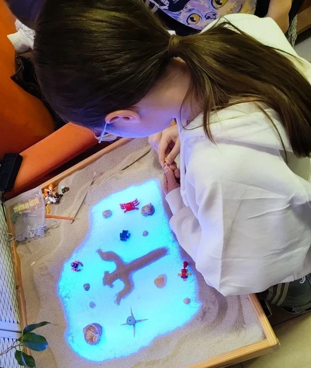 С детьми была проведена работа по методике песочной терапии. Взаимодействие с песком стабилизирует эмоциональное состояние ребёнка, улучшает самочувствие. В песочной среде могут проигрываться реальные жизненные ситуации, проблемы, с которыми ребёнок сталкивается в жизни. Он может здесь найти решение или изменить своё отношение к конфликтным ситуациям со сверстниками или взрослыми.