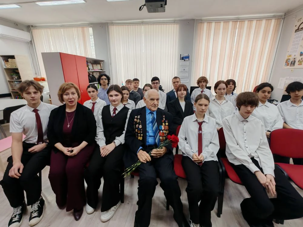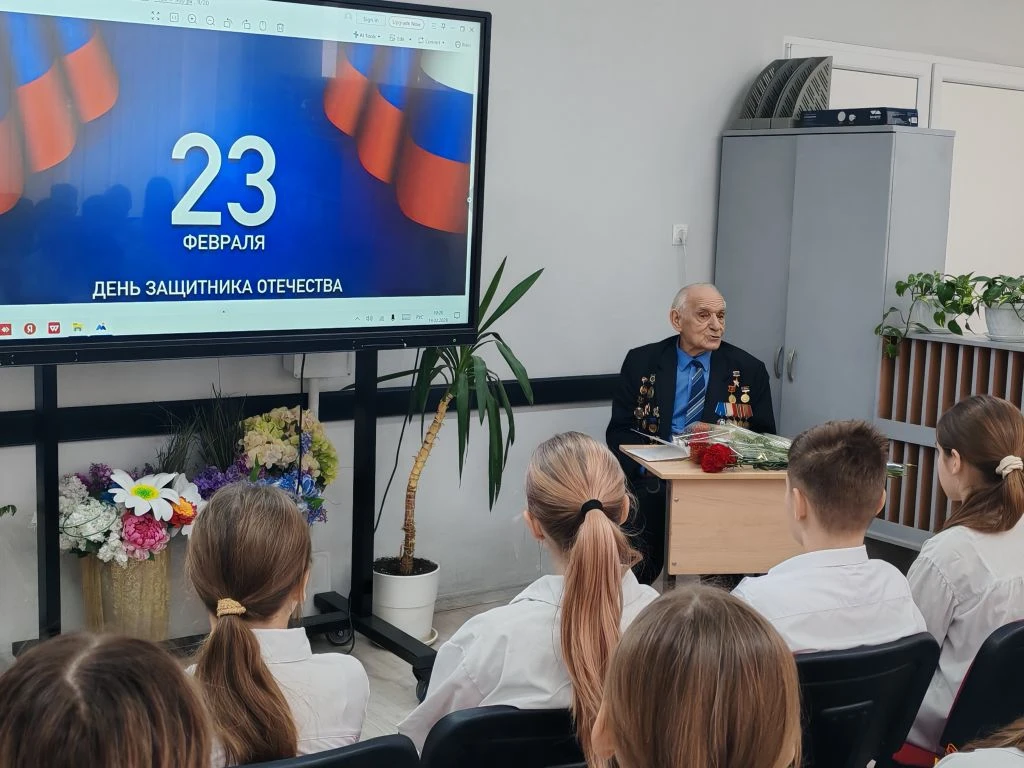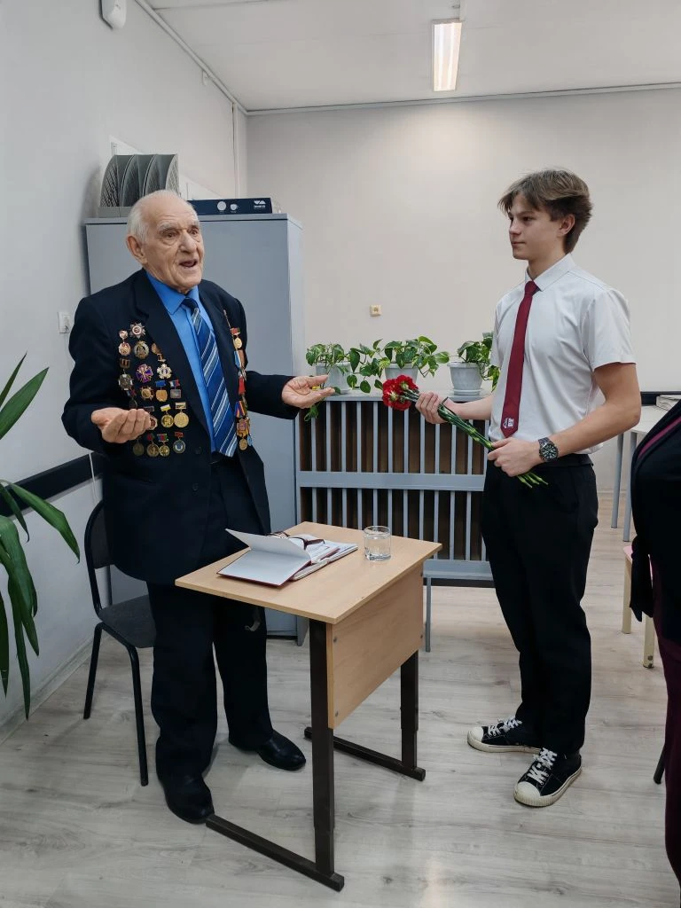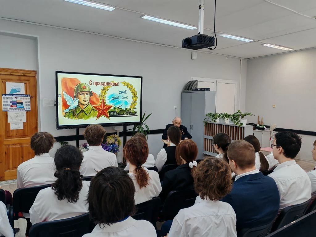 Анатолий Иванович встретился с учениками 11 А, 11 Б и 5 Е классов. Рассказал ребятам о своей боевой и трудовой жизни, поделился воспоминаниями о Великой Отечественной войне. До глубины души тронули всех стихи о Родине в исполнении ветерана. В завершение мероприятия, ребята получили мудрые напутствия и поздравили Анатолия Ивановича с наступающим Днем защитника Отечества.