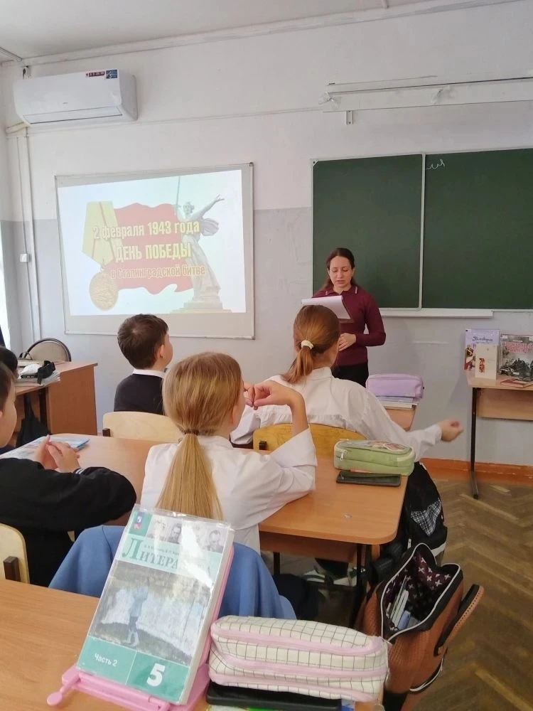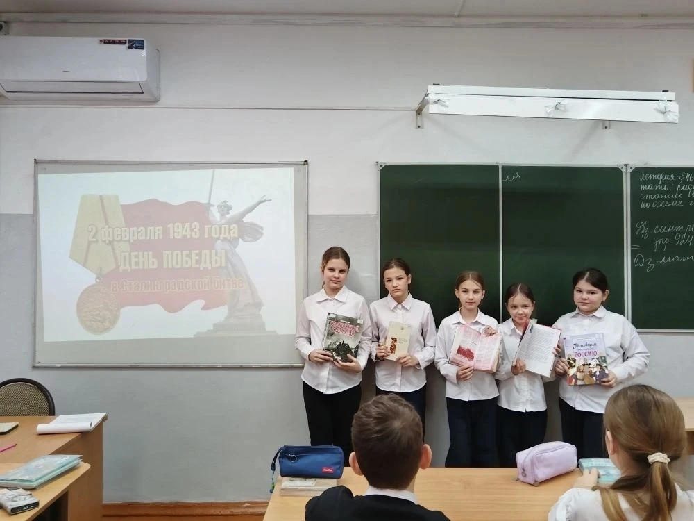Школьная библиотека, библиотека им. Т.Г. Шевченко, библиотека МКР "Молодежный", советники директора по воспитанию, педагоги, организовали и провели для ребят: торжественную линейку; интерактивный урок «Сталинград: 200 дней мужества»; кинолектории «Сталинград», "Не в бой солдаты уходили, а шли в историю они", марафон чтения "в рамках IX Всероссийской акции "200 минут чтения: Сталинграду посвящается".