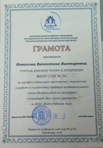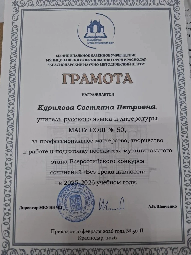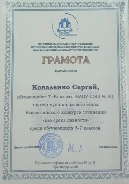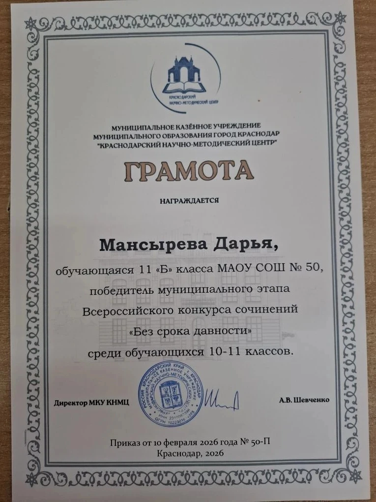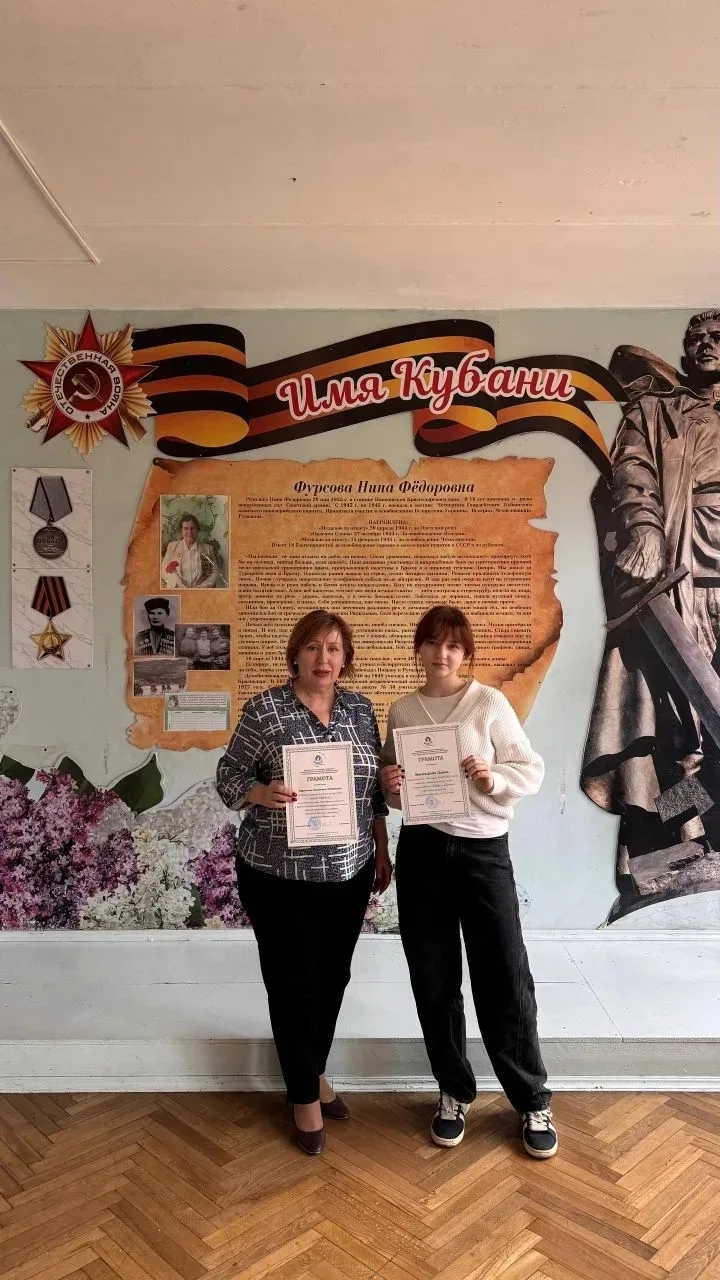 Поздравляем Мансыреву Дарью - победителя муниципального этапа и призёра регионального этапа всероссийского конкурса "Без срока давности" (наставник - Курилова Светлана Петровна, учитель русского языка и литературы) и Коваленко Сергея - призёра муниципального этапа всероссийского конкурса сочинений "Без срока давности" (наставник - Новикова Валентина Викторовна,учитель русского языка и литературы). Гордимся! Молодцы!👏🎉