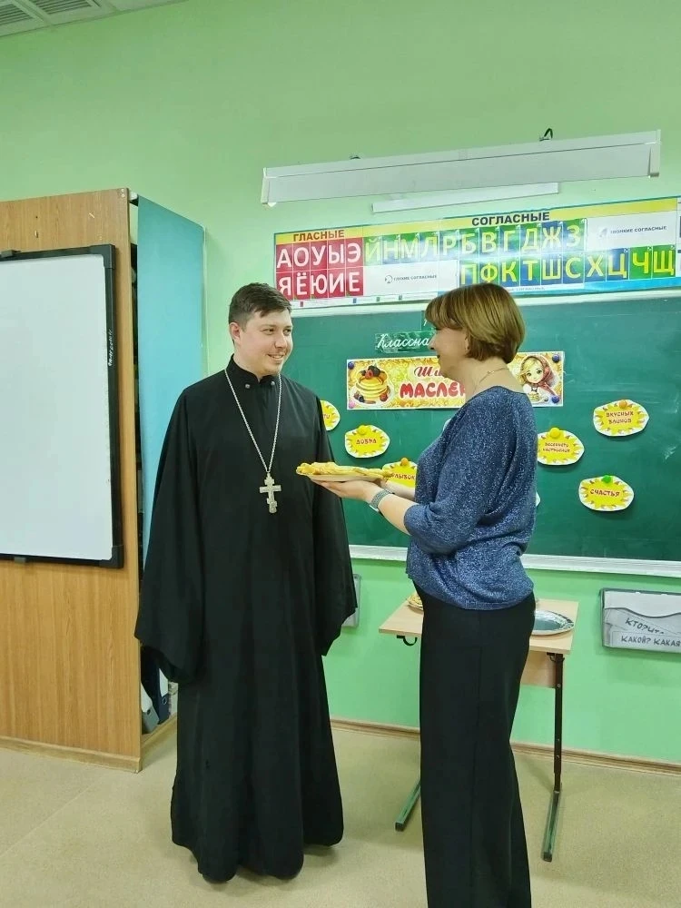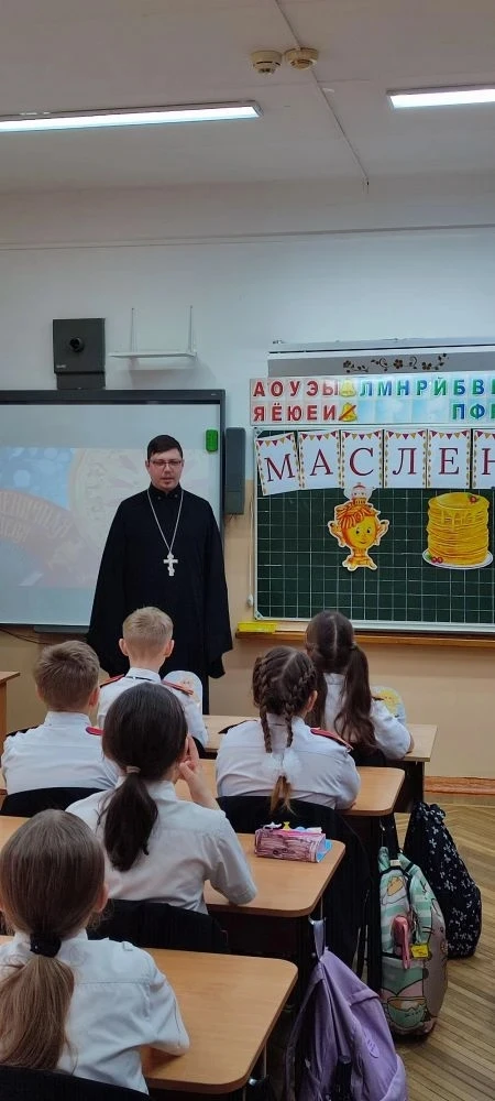 Сегодня нашу школу посетил Иерей Максим Печёркин, настоятель строящего храма святителя Тихона Патриарха Московского. Он встретился с учениками 3а и 3б классов и рассказал о Масленице.
