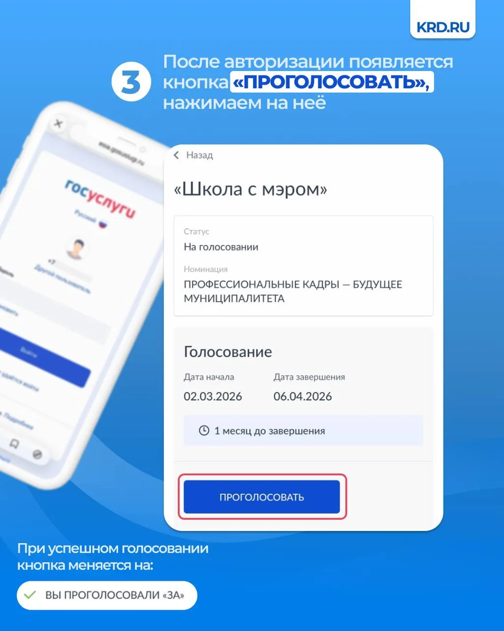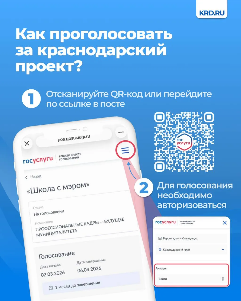 — Проект «Школа с мэром» вошёл в топ-110 Всероссийской премии «Служение». Голосование стартовало и продлится до 6 апреля. Теперь только от нас с вами зависит, станет ли краснодарский проект победителем премии, — написал (vk.ru/wall778163662_14543) руководитель кубанской столицы.