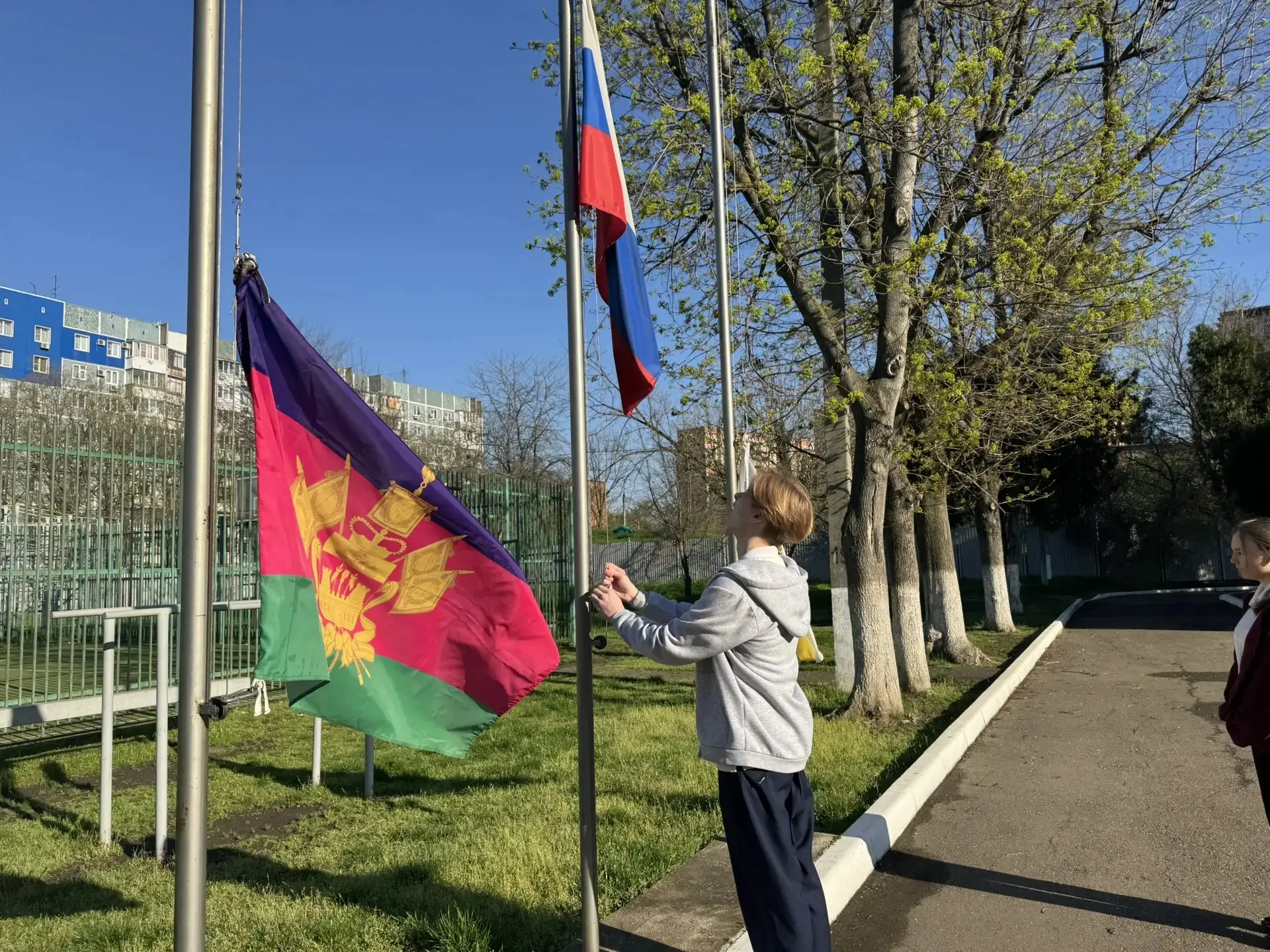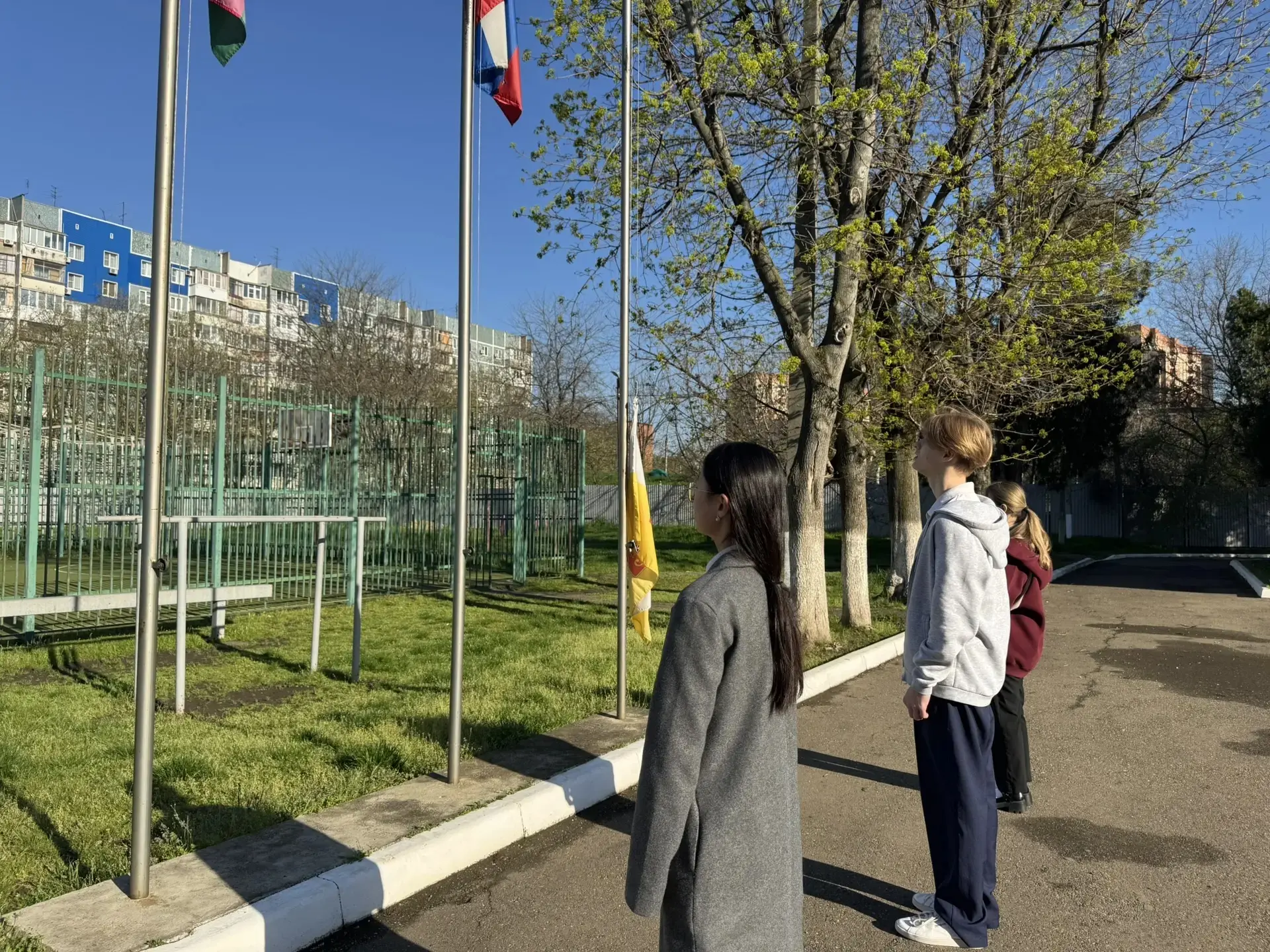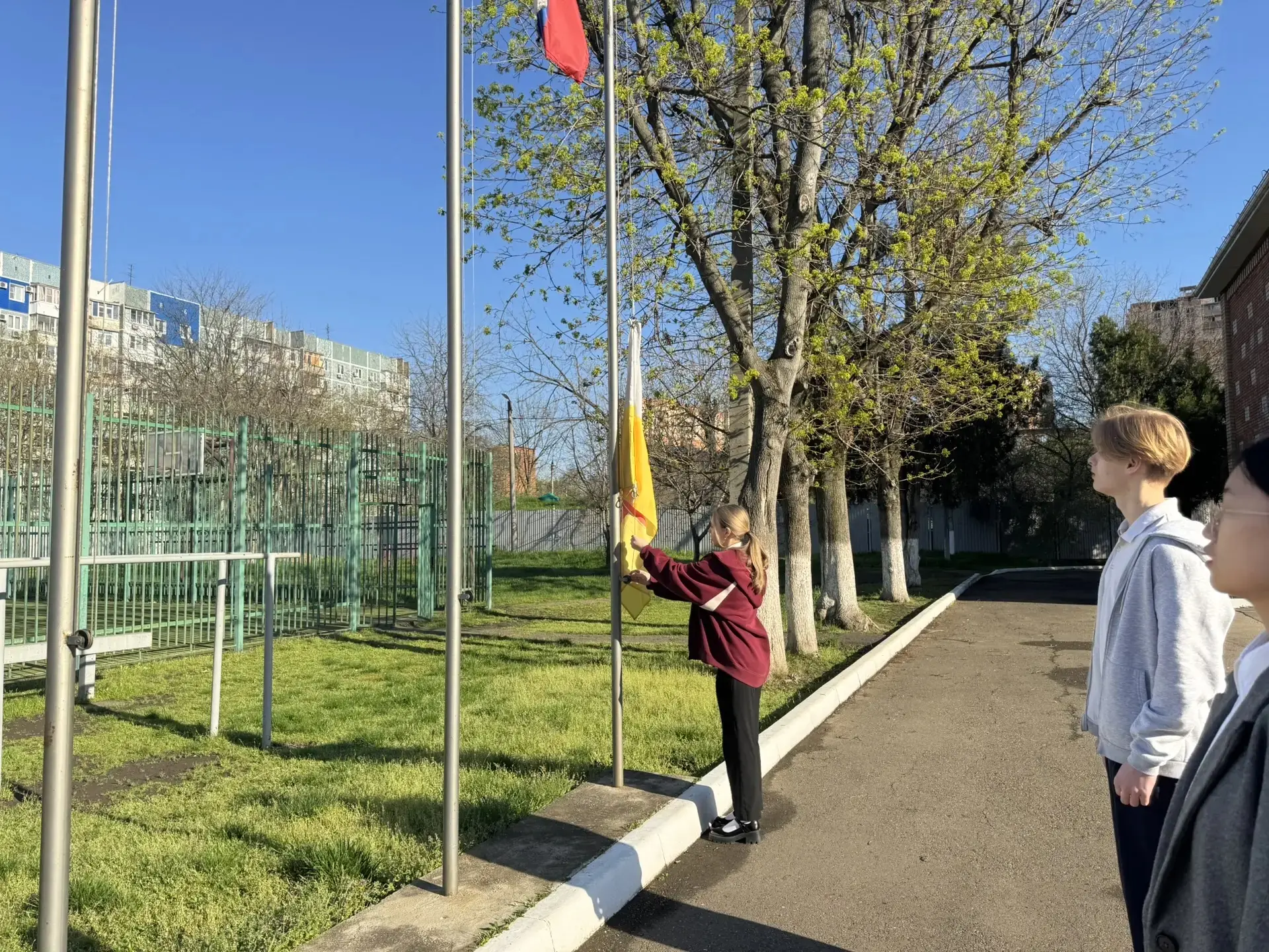 Линейка 6 апреля, на которой флаги поднимали учащиеся 10Б и 10В классов.