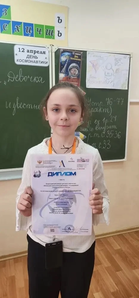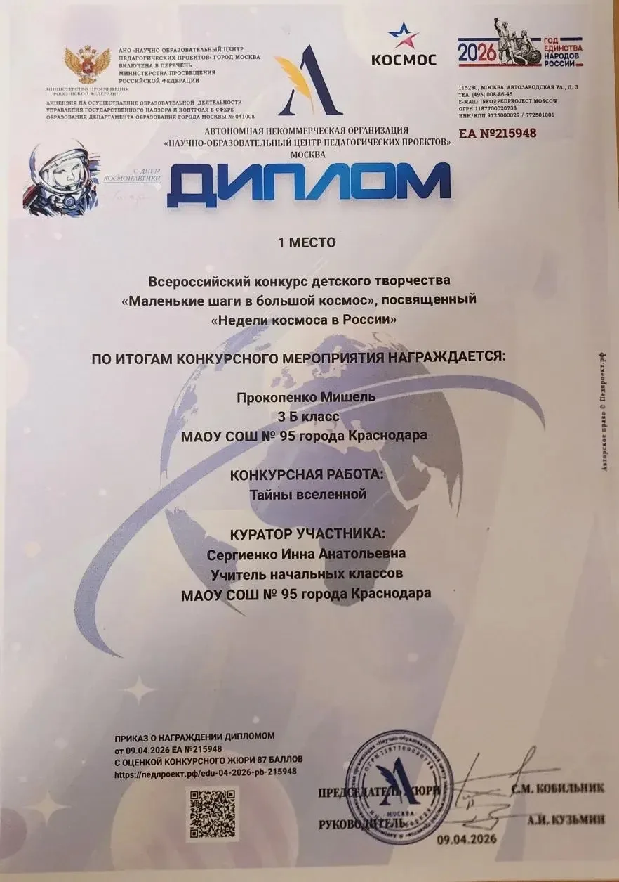 У нас потрясающая новость! 🎉 Наша талантливая ученица Прокопенко Мишель (3 «Б» класс, МАОУ СОШ № 95 г. Краснодара) заняла 1 место во Всероссийском конкурсе детского творчества «Маленькие шаги в большой космос», посвящённом «Неделям космоса в России»! 🚀🌌