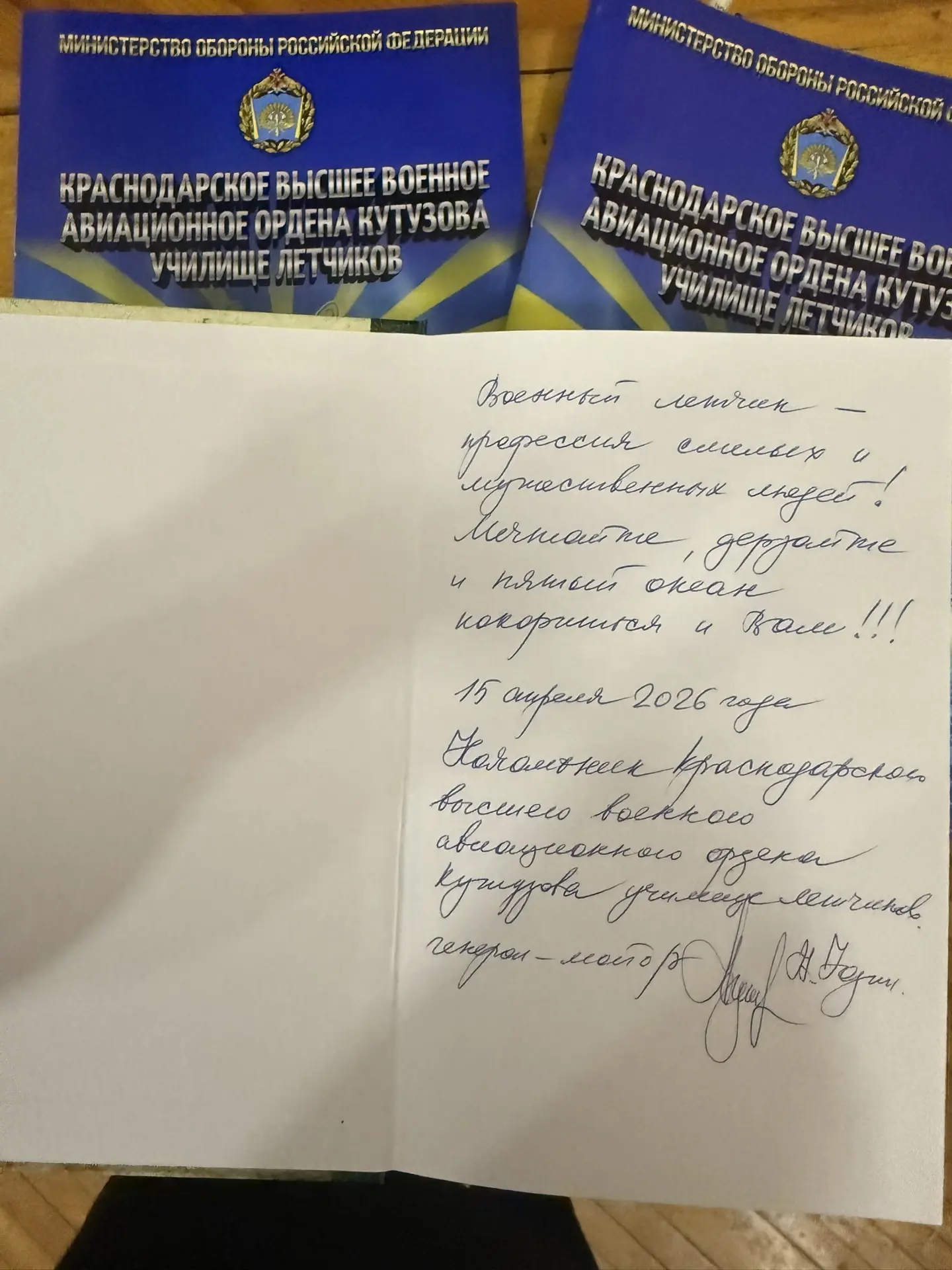 В завершение встречи школа получила особенный подарок — книгу с тёплыми и вдохновляющими напутственными словами от генерала лётного училища 📚💌❤️