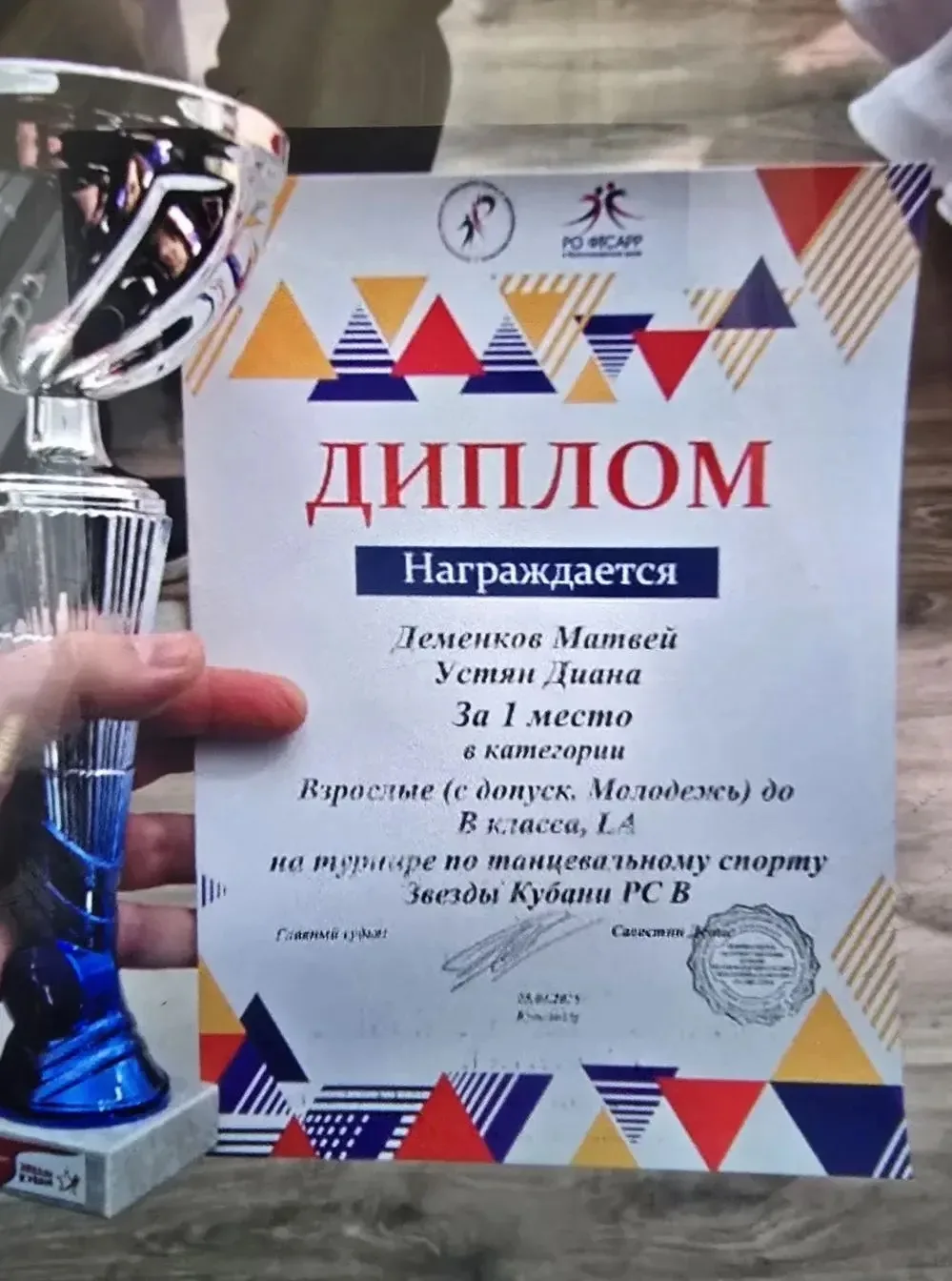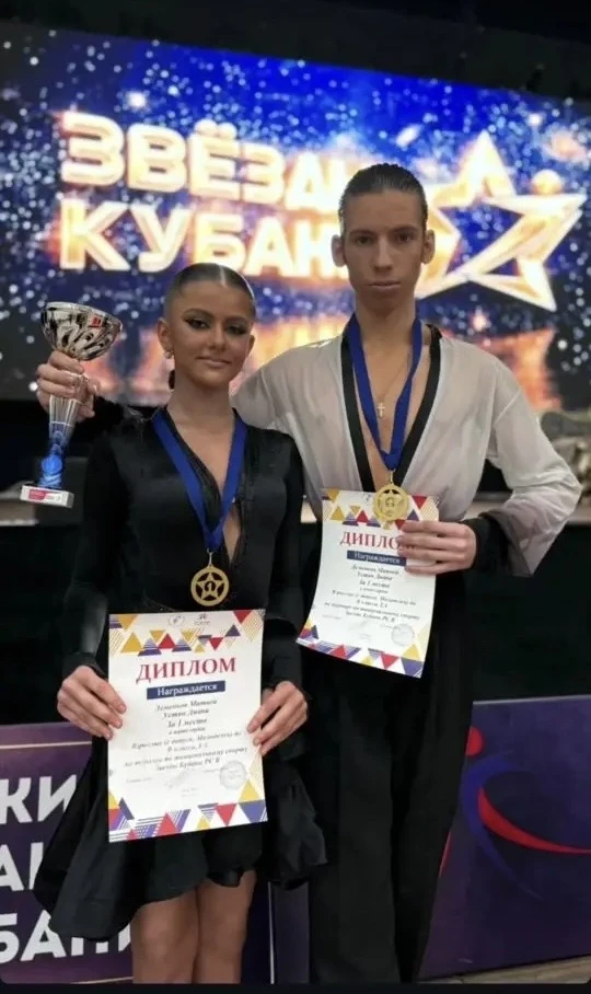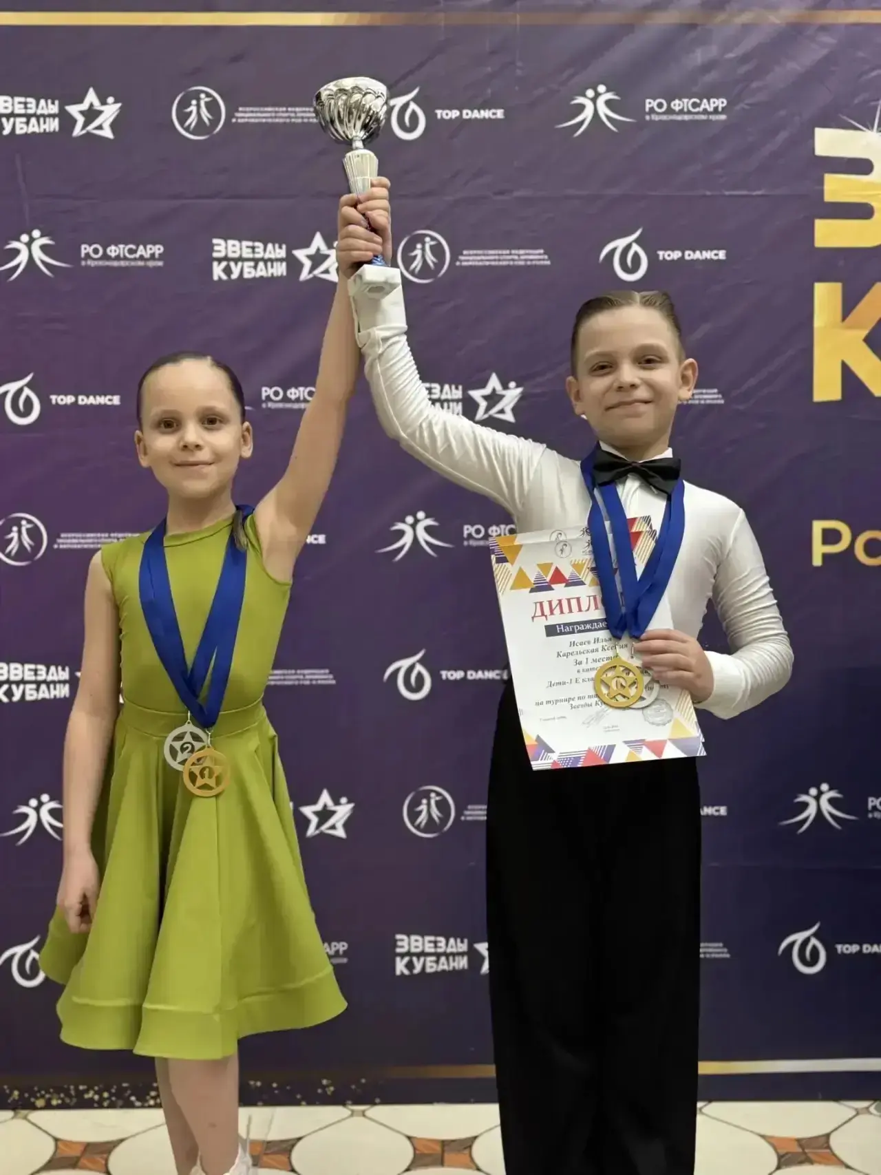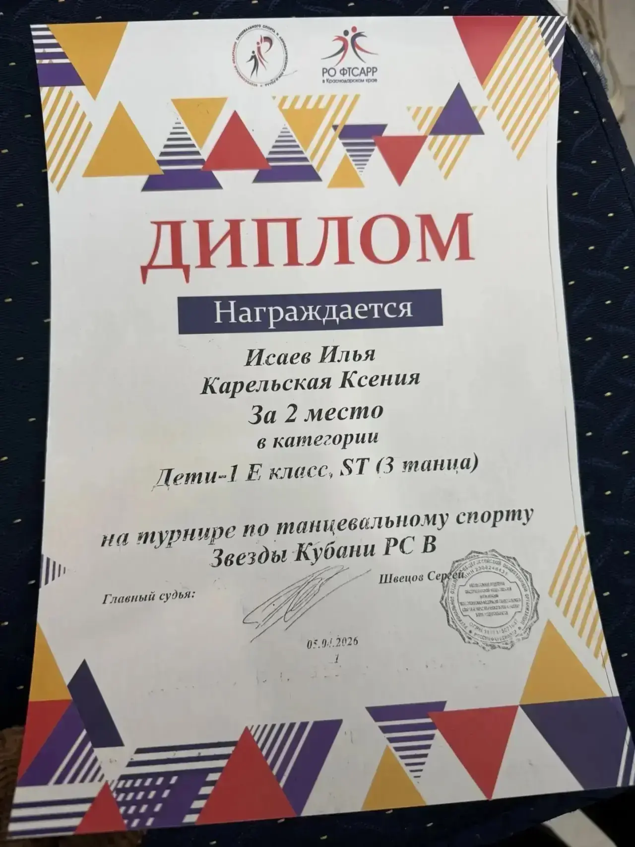 ⭐️На турнире по танцевальному спорту Звезды Кубани РС, прошедшему 5.04.2026 года в г. Краснодаре, ученик 2 «А» класса Исаев Илья и Карельская Ксения заняли 1 место в Латиноамериканской программе и 2 место в Европейской программе✨