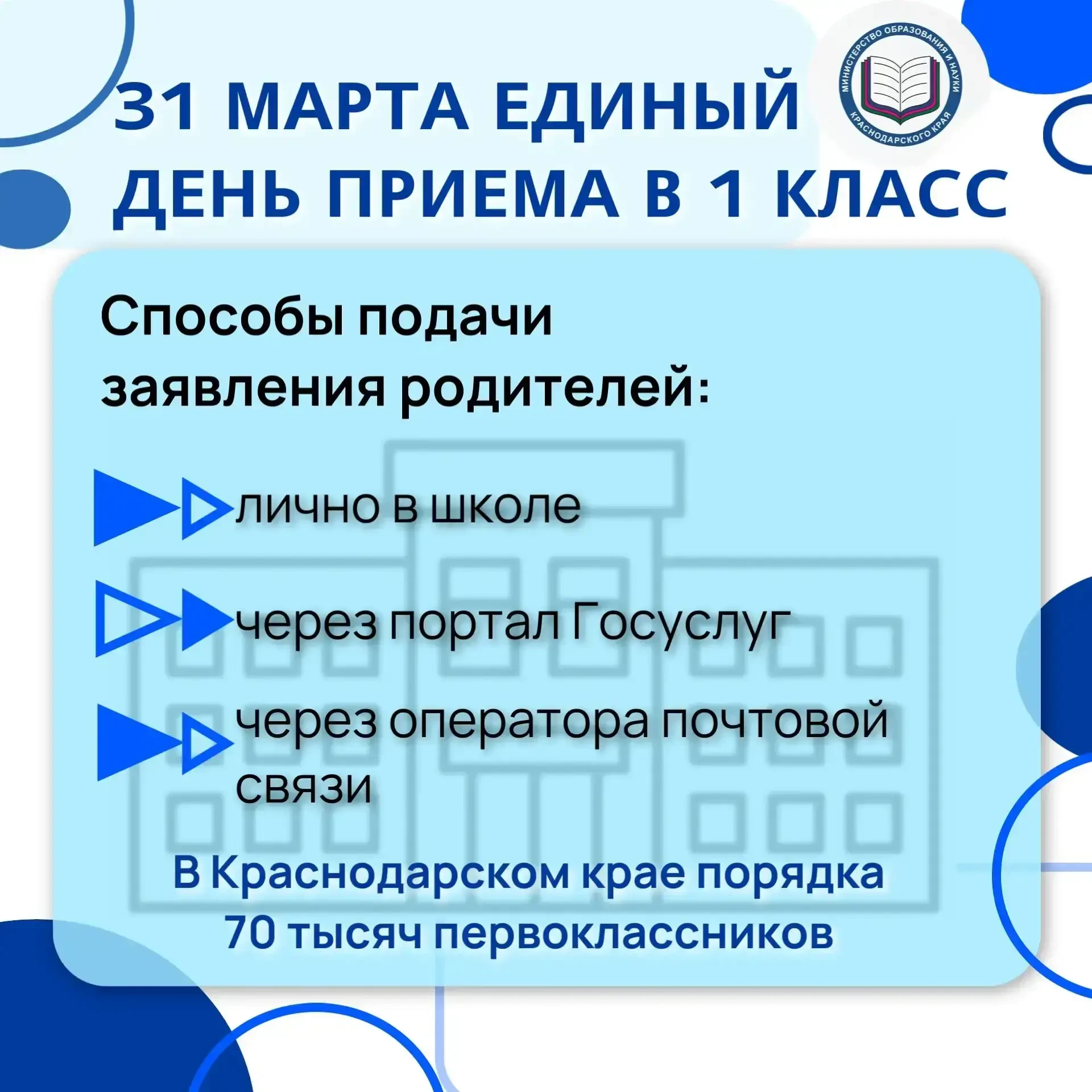 🔔 31 марта 2026 года – единый день начала приёма заявлений в первый класс в Краснодарском крае!