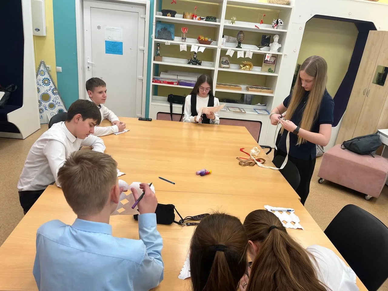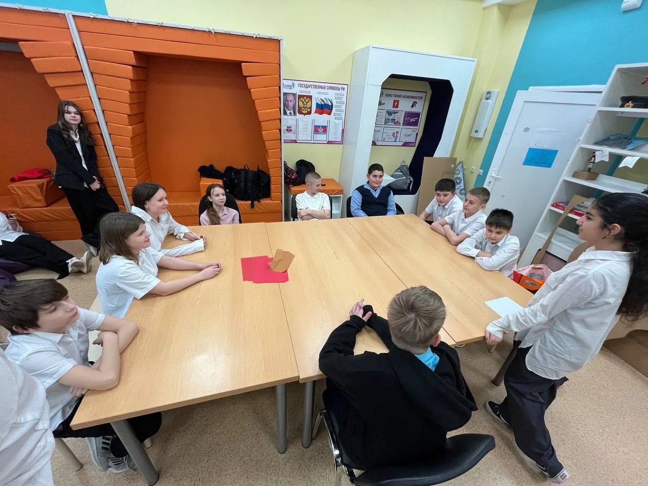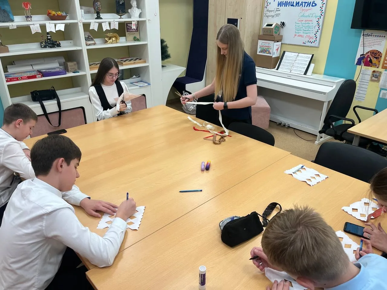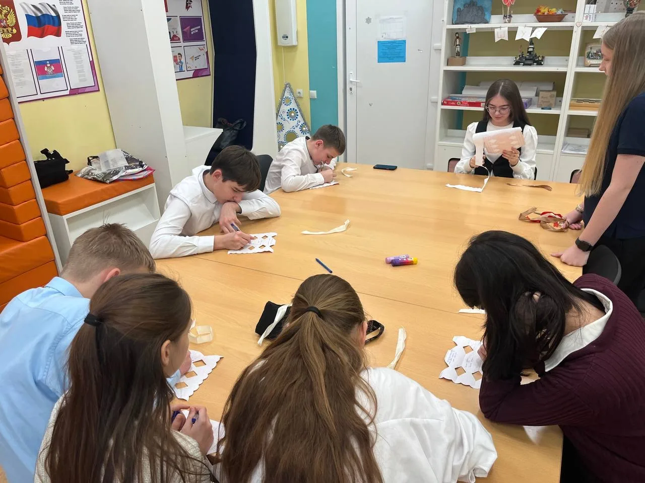 💙 Из подготовленной развертки в виде конфет с логотипом Движения Первых ребята сделали оригинальные коробочки-открытки. Внутри написали теплые поздравления.