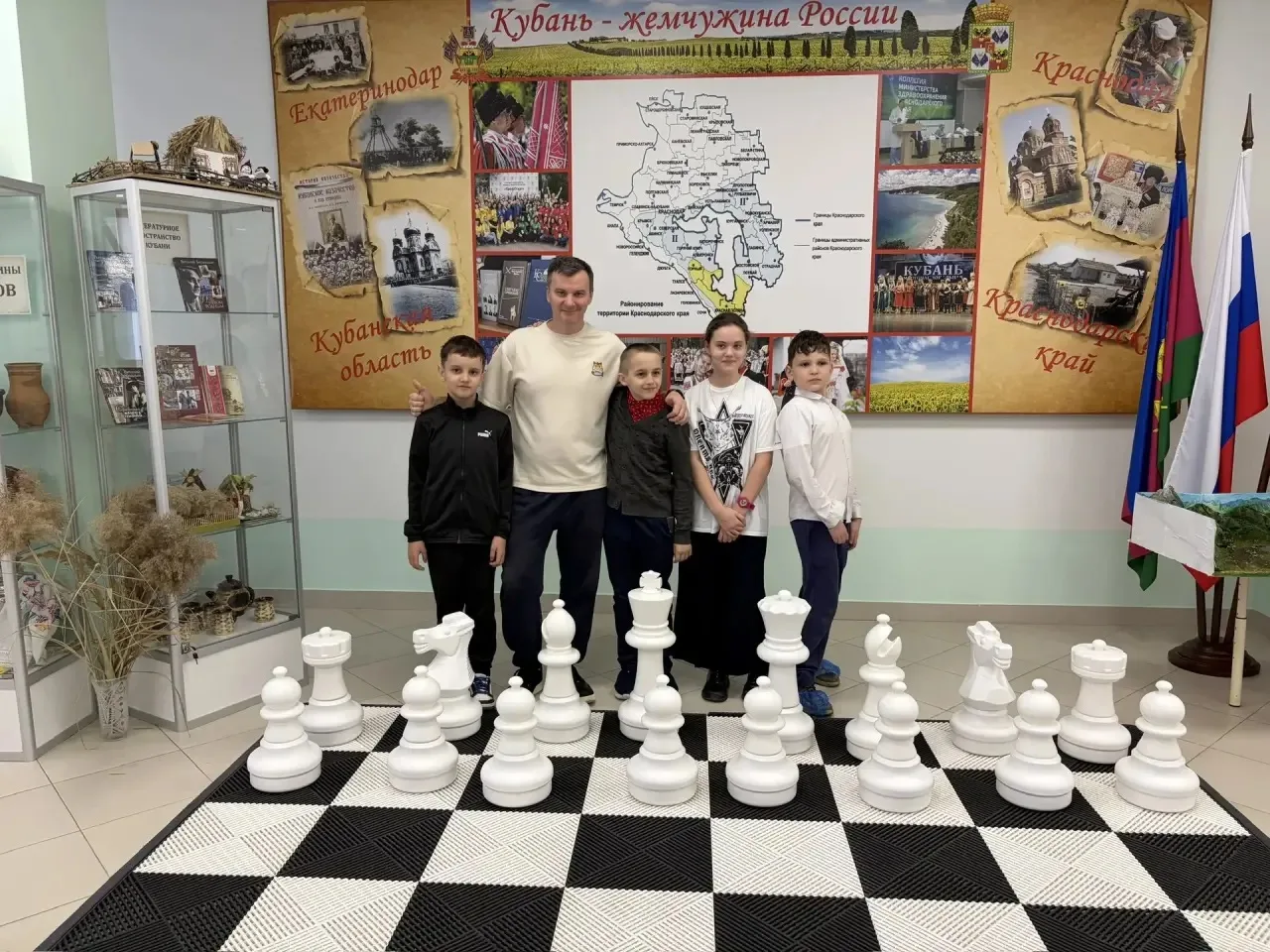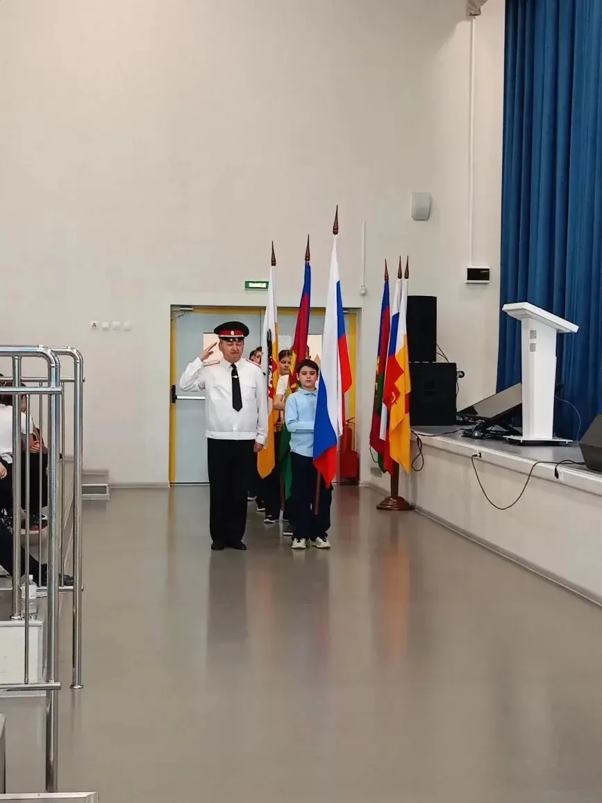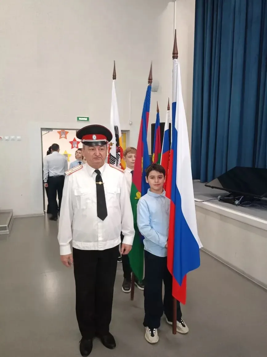 02.03.26г. казак-наставник Потовой В. И. в рамках урока о важном произвёл со знаменосцами 5 "О" класса вынос флагов: Российской Федерации, Кубани и г. Краснодара.