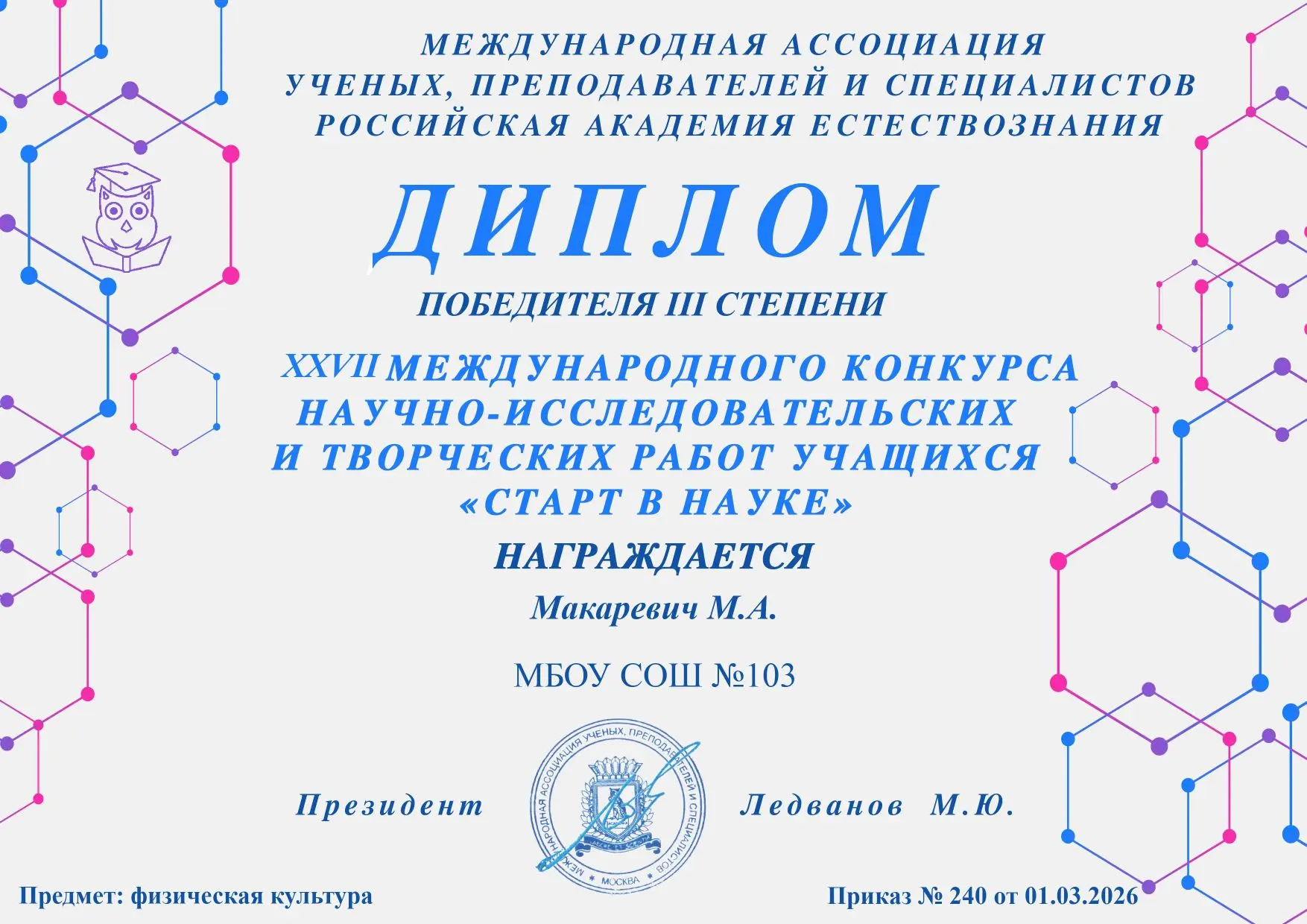В марте этого года ученица 6Е класса Марта Макаревич стала призёром 🏆 Международного конкурса исследовательских работ учащихся "Старт в науке".👩🔬 Научный руководитель - психолог школы 103 Мазепа Елена Александровна. Проект так же отмечен участием в тематической смене Международного детского центра "Артек". 📍
