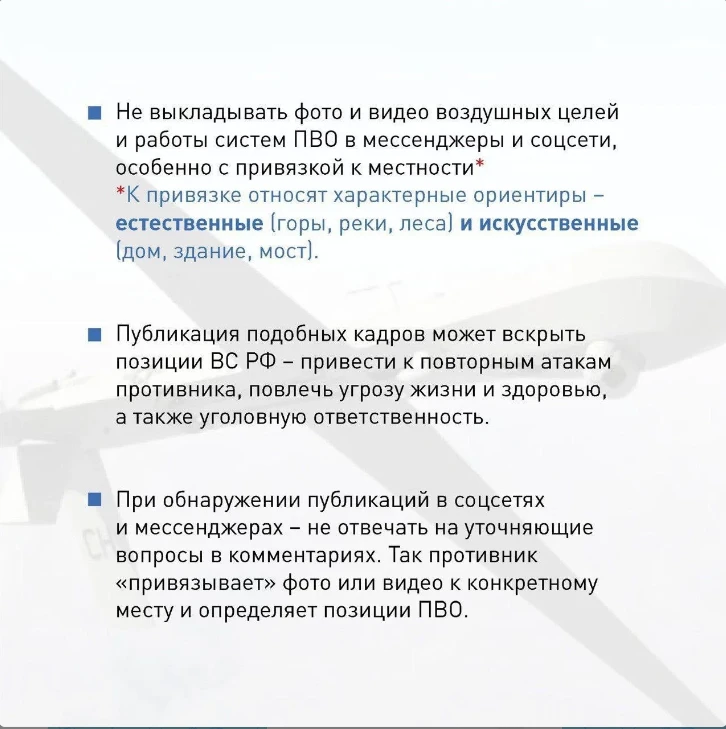 Публикация подобных кадров может вскрыть позиции Вооруженных сил РФ – привести к повторным атакам противника на военные и гражданские объекты, повлечь угрозу жизни и здоровью, а также уголовную ответственность.