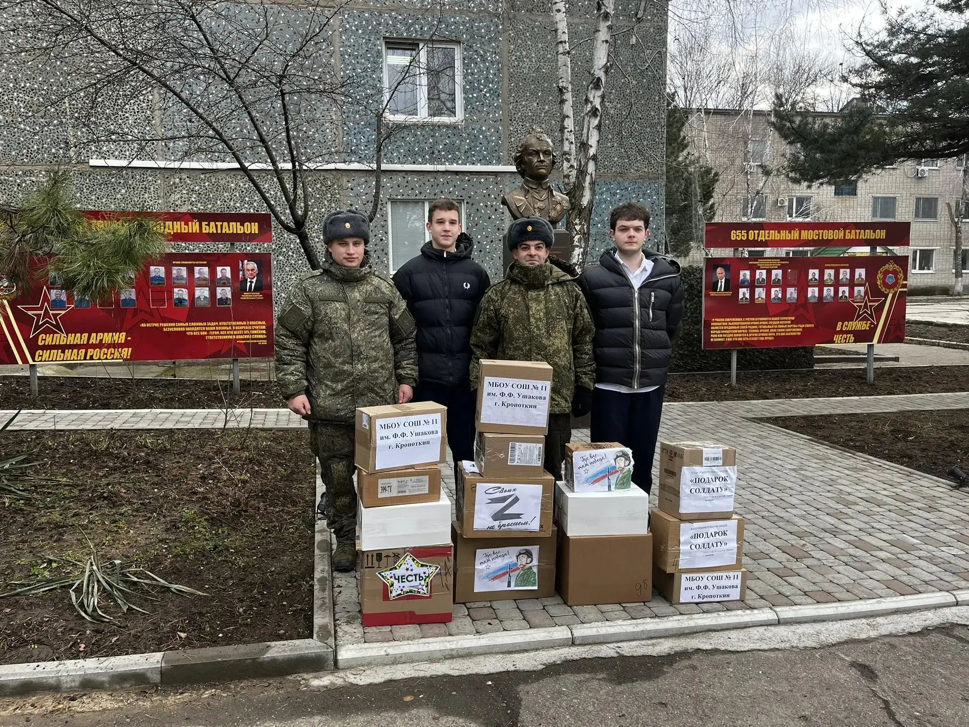 В преддверии Дня защитников Отечества по инициативе директора школы Тимченко Г.А. в МБОУ СОШ № 11 им. Ф.Ф. Ушакова прошла акция "Посылка солдату", в которой приняли участие ученики, родители и педагоги школы. В рамках акции была собрана гуманитарная помощь, а также "сладкие кружки солдатам" для бойцов, находящихся в зоне боевых действий.