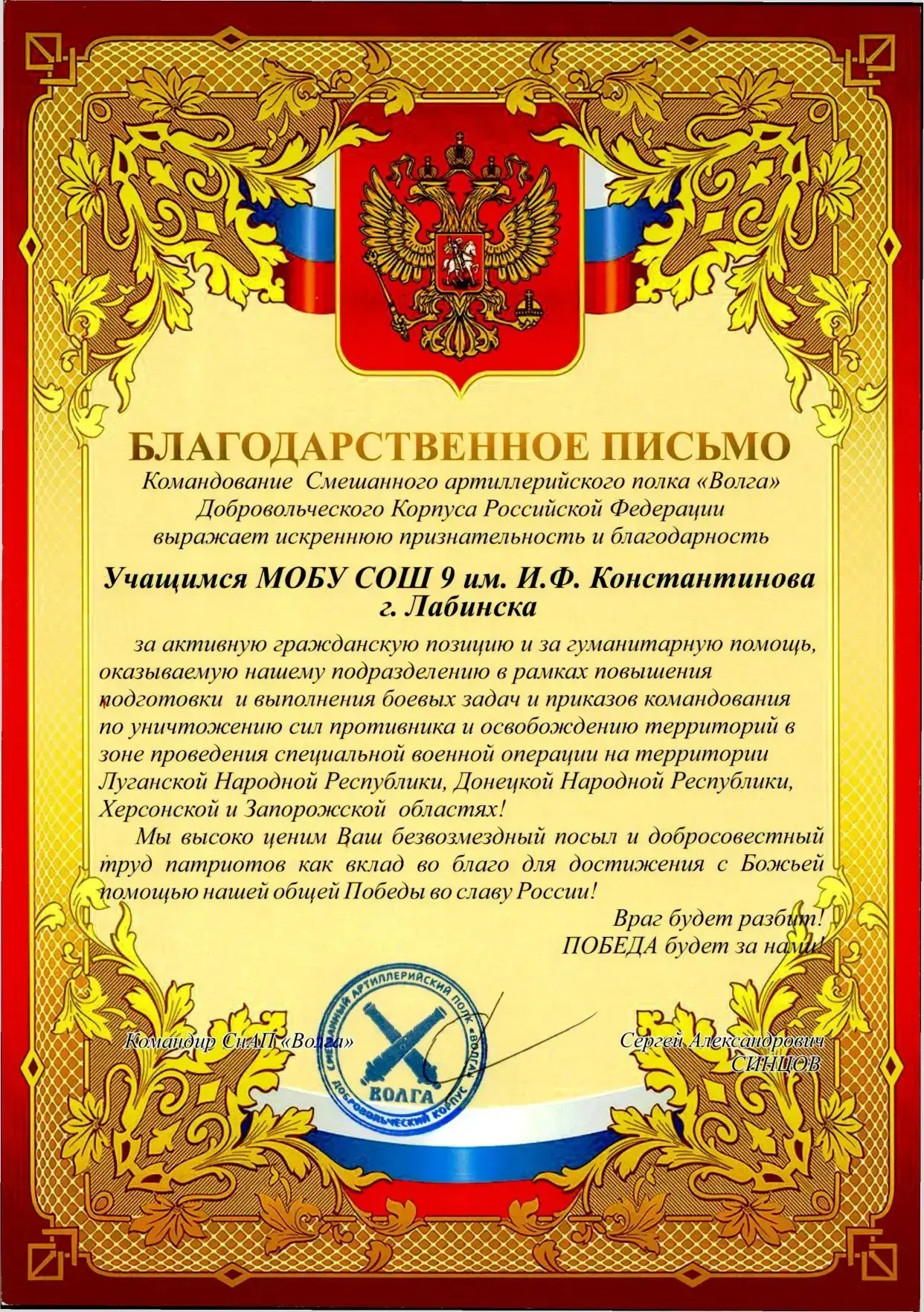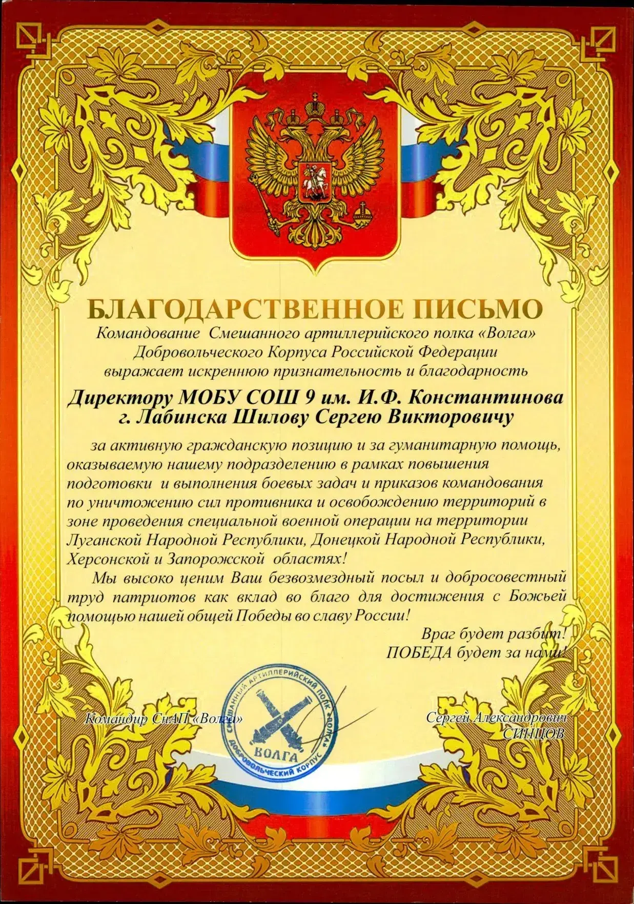 Школа была удостоена высокой чести — благодарственные письма получили директор Сергей Викторович Шилов, педагогический коллектив и учащиеся от командованияк смешанного артиллерийского полка «Волга» добровольческого корпуса Российской Федерации. 🇷🇺