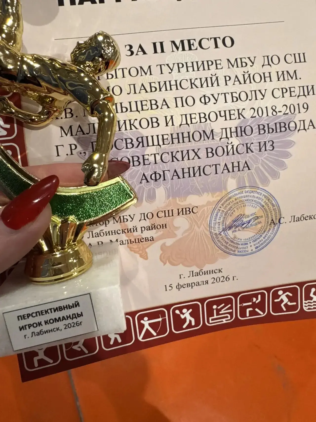 📌 15.02.2026 года в СК «Олимп» прошел турнир среди мальчиков и девочек 2018-2019 г.р. посвященный Дню вывода Советский войск из Афганистана . Участие принимали команды из г.Лабинск, ст.Владимирской, ст. Вознесенской, г.Армавир, с.Успенское . Среди 6 команд , только одна команда - девочек «Лабушка». А капитан команды - наша Костина Ульяна , ученица 1 Б класса . Команда заняла 2 место , а капитан команды - Ульяна, отмечена статуэткой « ПЕРСПЕКТИВНЫЙ ИГРОК КОМАНДЫ». 🤩🤩🤩