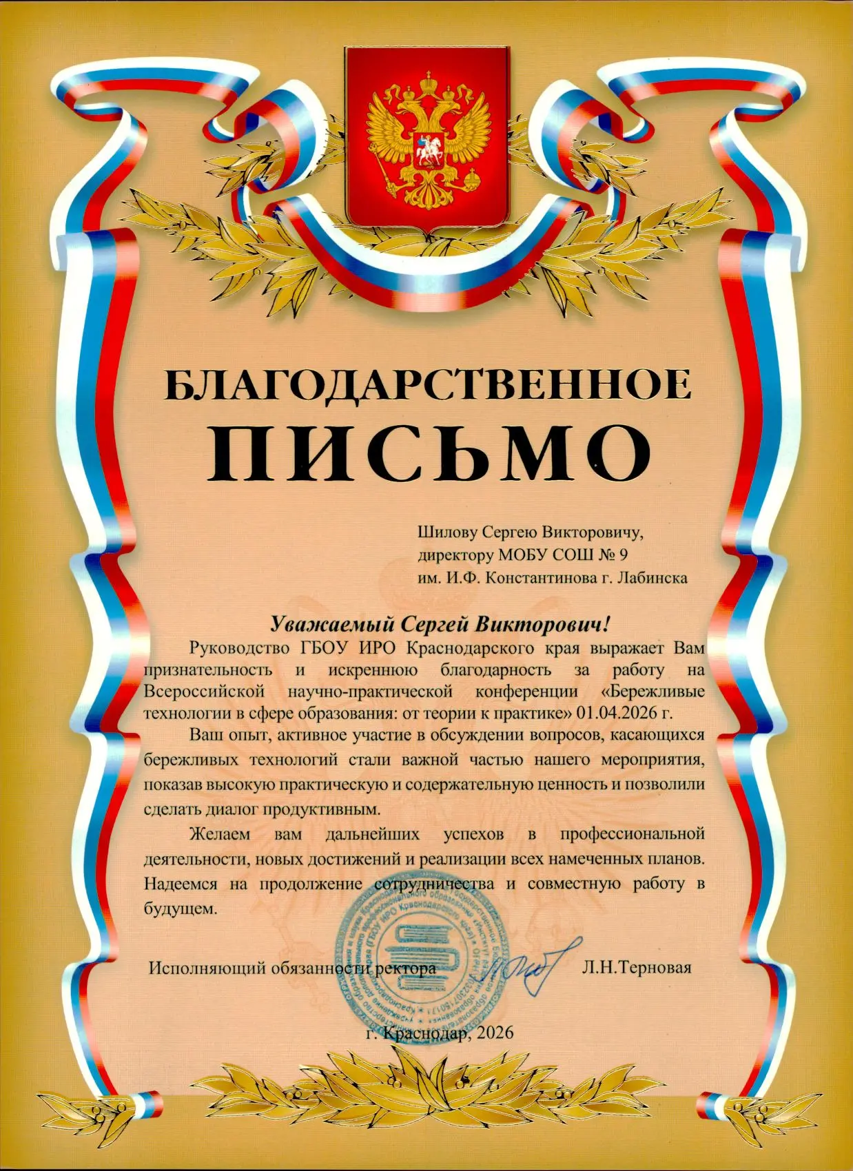 Сергей Викторович получил благодарственное письмо от Института развития образования Краснодарского края за работу на Всероссийской научно-практической конференции. 🙌