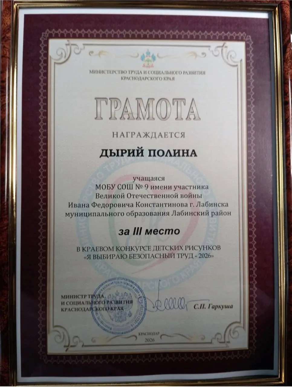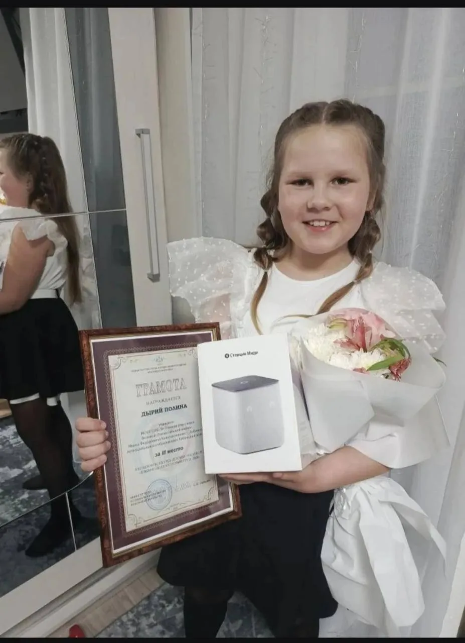 ❗️ Наша ученица 3 Г класса Дырий Полина с проектом «Древо безопасности» (наставник- Татьяна Анатольевна Грицаева) заняла 3 место в Краевом конкурсе детских рисунков "Я выбираю безопасный труд - 2026". Вместе с грамотой и цветами ей вручили ценный приз - Умную колонку. Поздравляем ученицу и наставника!! Молодцы!!! 🤩🤩🤩