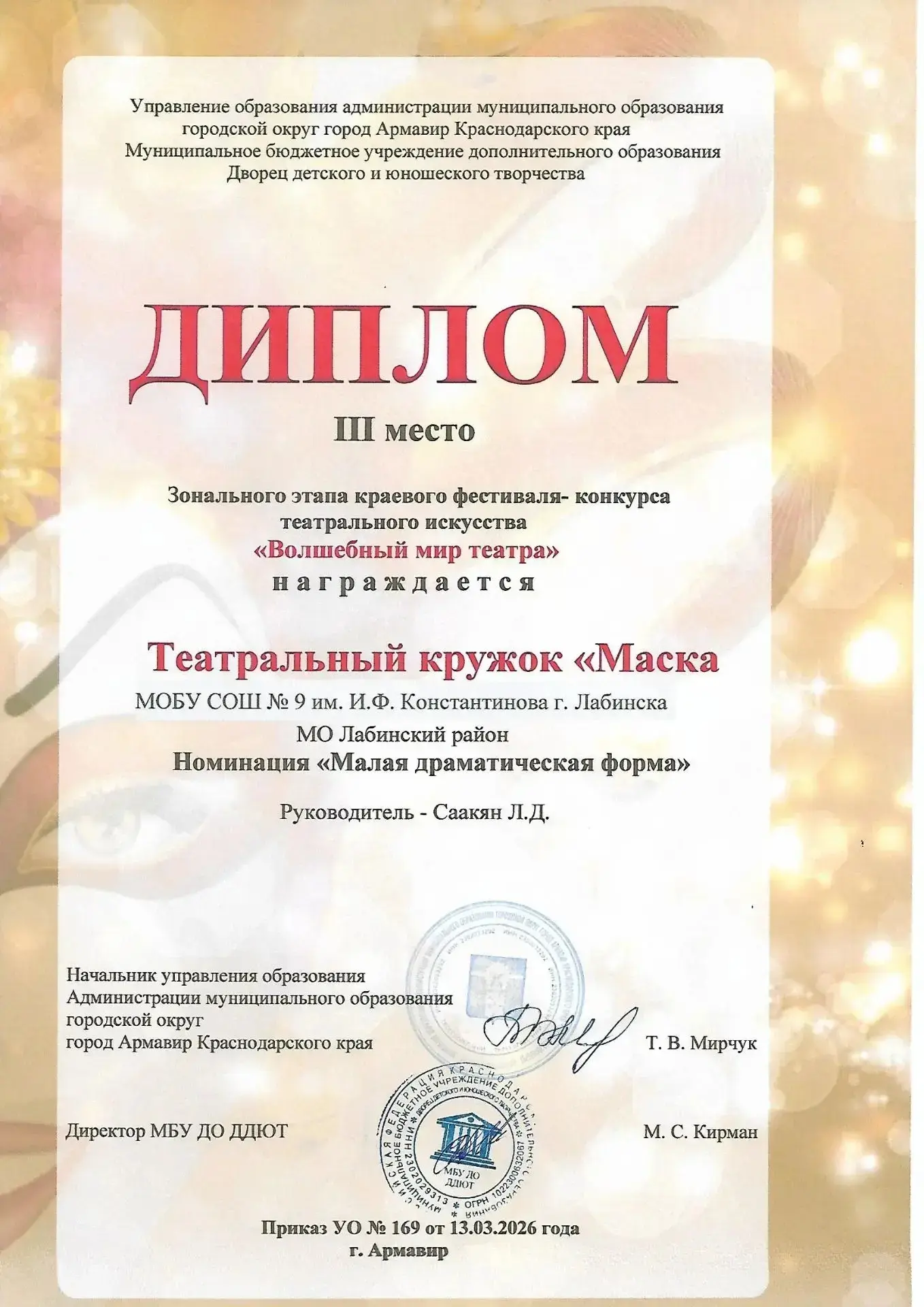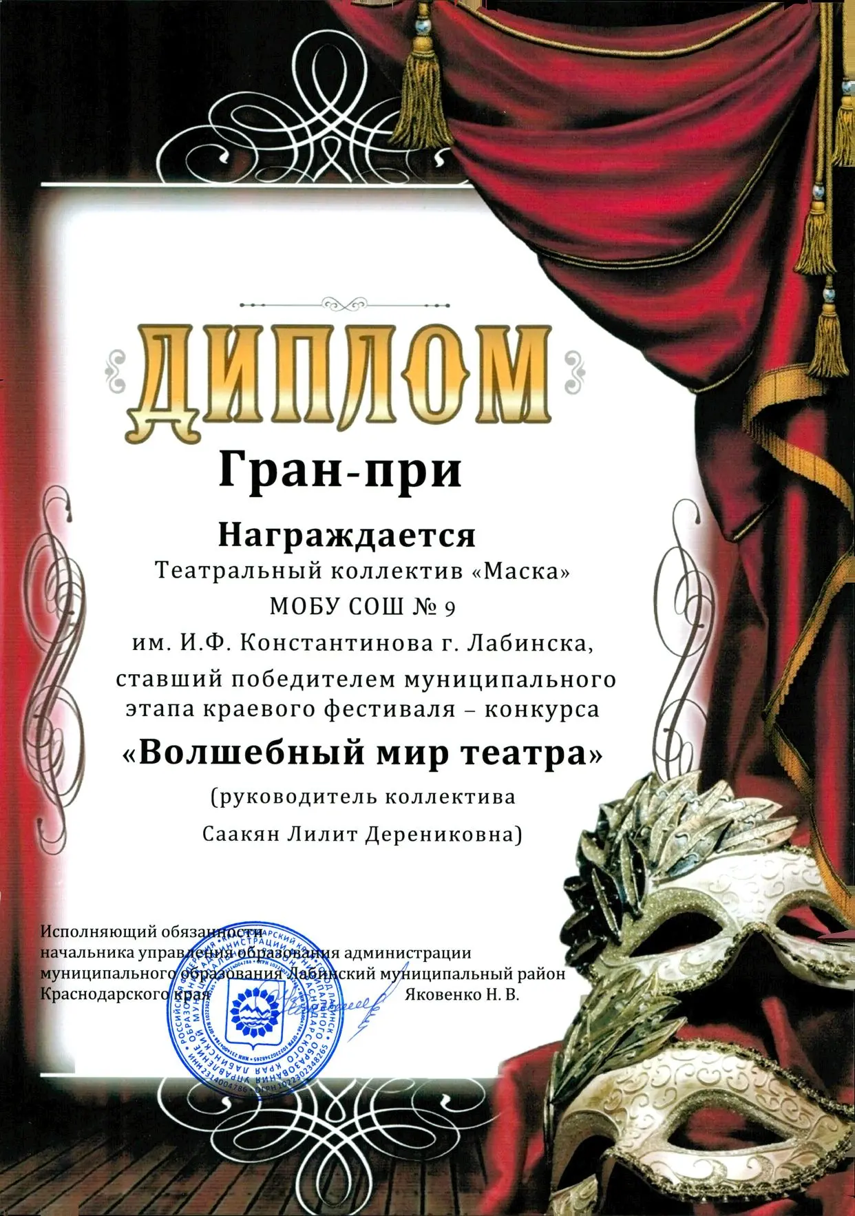 🎭 Наш школьный театральный кружок «Маска» под руководством педагога дополнительного образования Лилит Дерениковны Саакян стал обладателем Гран-при на муниципальном этапе краевого фестиваля - конкурса «Волшебный мир театра»!🏆