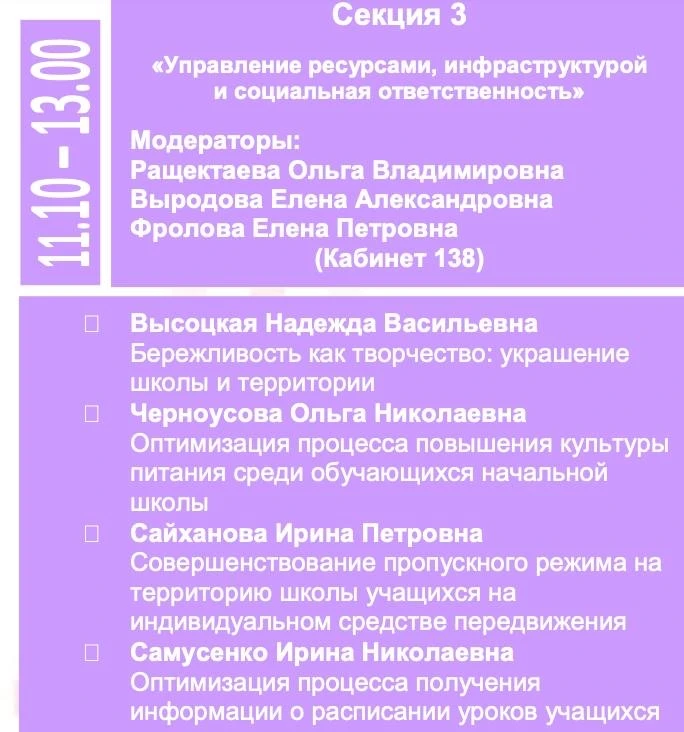 Наши педагоги также внесли вклад в успех мероприятия. Ирина Николаевна Самусенко представила проект по оптимизации процесса получения информации учащимися о расписании уроков, а Ирина Петровна Сайханова рассказала о проекте по совершенствованию пропускного режима на территорию школы для учащихся на индивидуальном средстве передвижения.