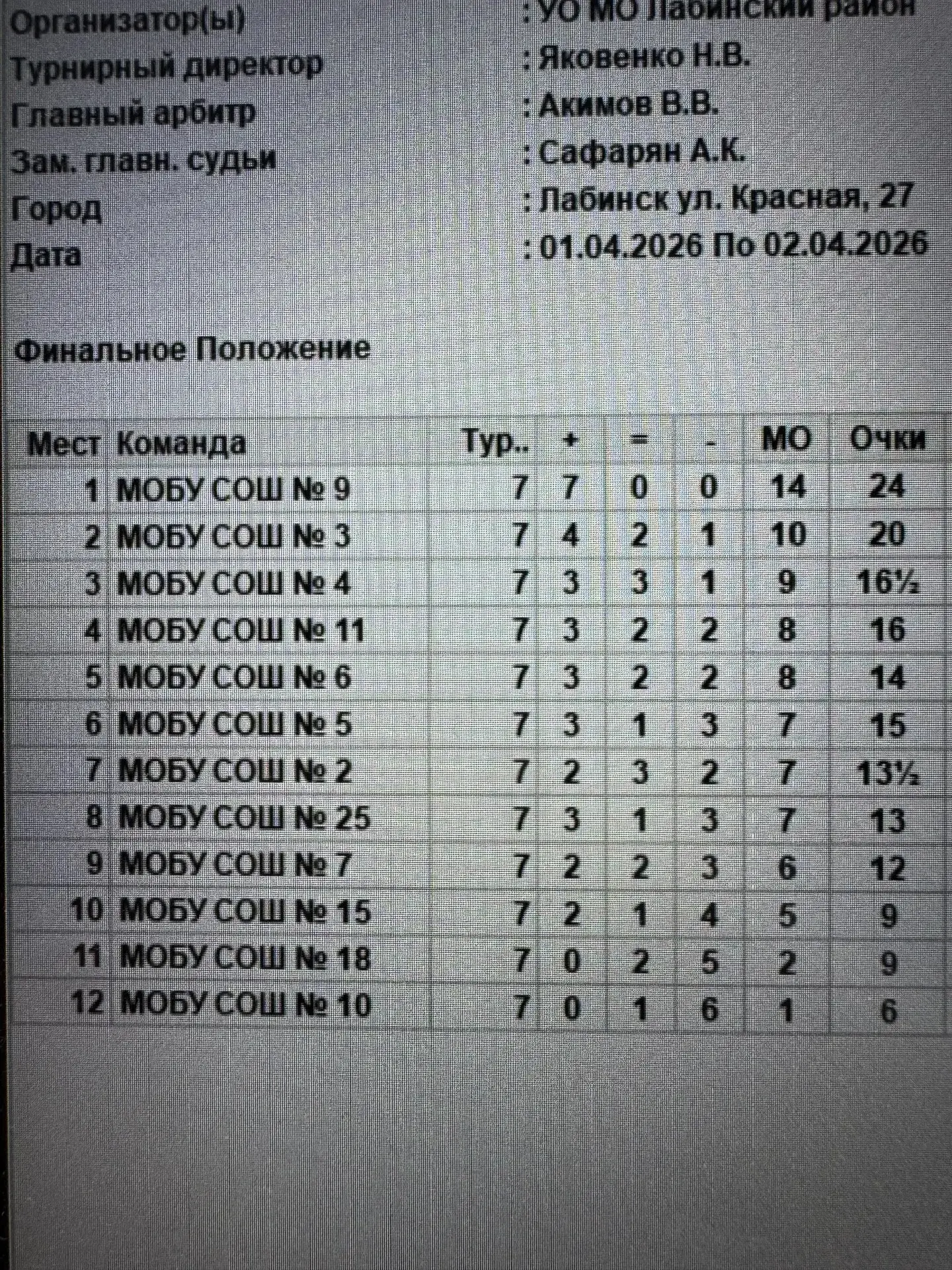 📌 В нашей школе 28 марта прошел турнир по быстрым шахматам на Первенство МОБУ СОШ N 9 среди учащихся 1-4 классов. В нем приняли участие 28 детей из начальных классов. Соревновались в двух возрастных группах. 🐴 В старшей группе (2016-2017 г. р.) 1 место, с результатом 7 очков в семи партиях завоевал ученик 3 А класса Асламазян Богдан. 2 место (5 очков) у Данильченко Бориса, 3 А класс, 3 место (4 очка) поделили Авдеева София (4 В), Арабачян Арман (3 В), Роганов Денис (3 В) и Сиваков Григорий (1 Г). 🐴 В младшей группе (2018-2019 г. р.) 1 место завоевал ученик 1 Г класса Зубрик Артем. 2 место - Дырий Дима, 1 А класс, 3 место - Духин Тимофей, 1 Б класс. 🥰🥰🥰