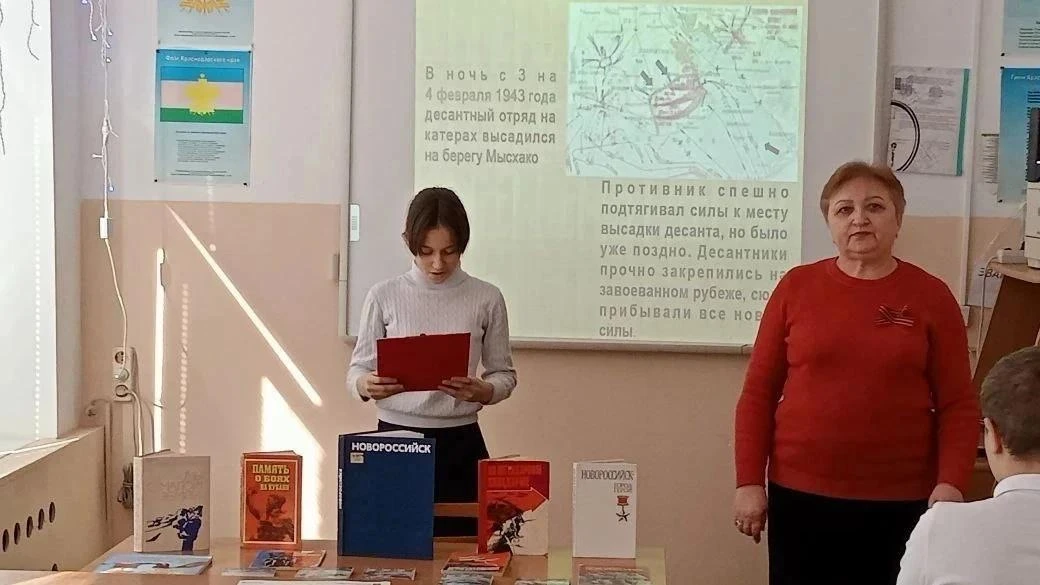 Сотрудник Модельной детской библиотеки имени А.С. Пушкина Кочетова Р.И. рассказала о героической высадке морского десанта под командованием Ц.Л. Куникова в феврале 1943 года. По пояс в ледяной воде 250 бойцов стремительно атаковали противника и, уничтожив около тысячи гитлеровцев, к рассвету 4 февраля захватили и героически удерживали плацдарм, названный позже "Малая земля". Жестокой была борьба за этот небольшой клочок земли, многие воины пали смертью храбрых. Однако фашисты так и не смогли сбросить десантников в море. За 225 огненных дней и ночей на Малую землю обрушилось 11 эшелонов вражеского металла.