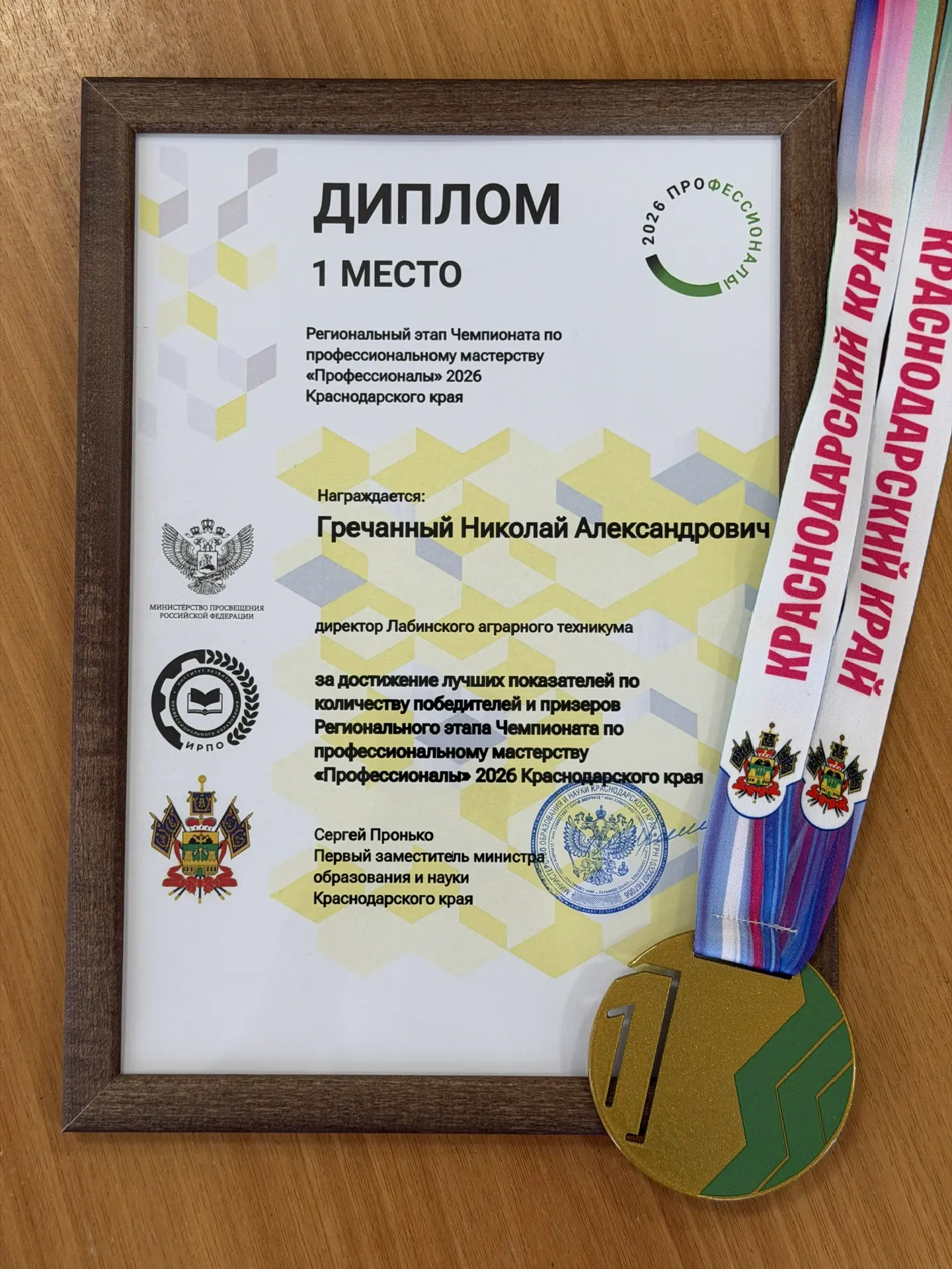 💥⚡️С гордостью сообщаем, что Лабинский аграрный техникум занял 1 место и награжден дипломом за достижение лучших показателей по количеству победителей и призеров Регионального этапа Чемпионата по профессиональному мастерству “Профессионалы” 2026 Краснодарского края, который вручен на сцене торжественной церемонии директору Гречанному Николаю Александровичу!