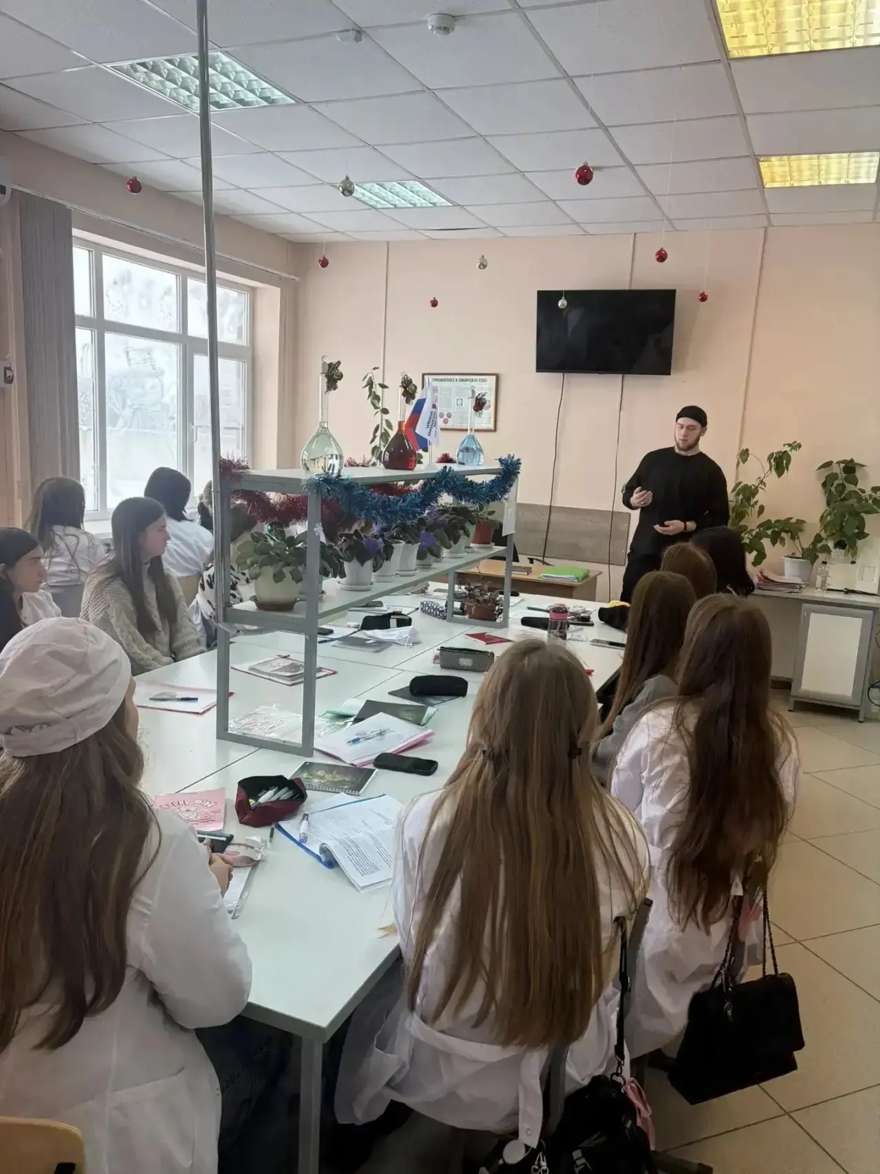 13 января 2026 года в Лабинском аграрном техникуме состоялась встреча студентов специальности «Ветеринария» с выпускником 2024 года Бородиным Никитой Алексеевичем, который строит свою карьеру в АО «Фирма «Агрокомплекс» им. Н.И. Ткачева ООО «ОПХ Племзавод «Ленинский путь».