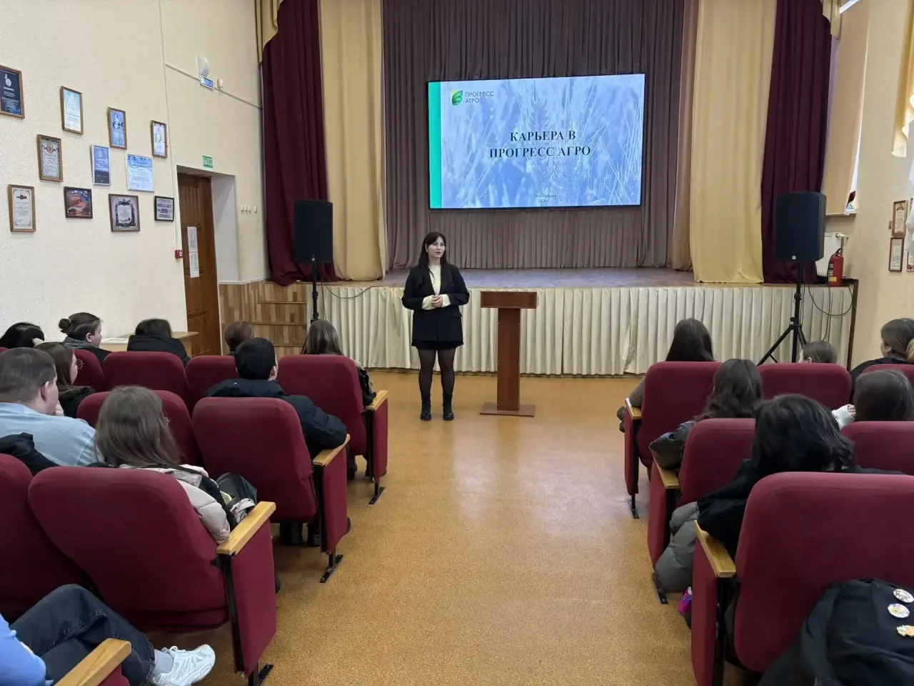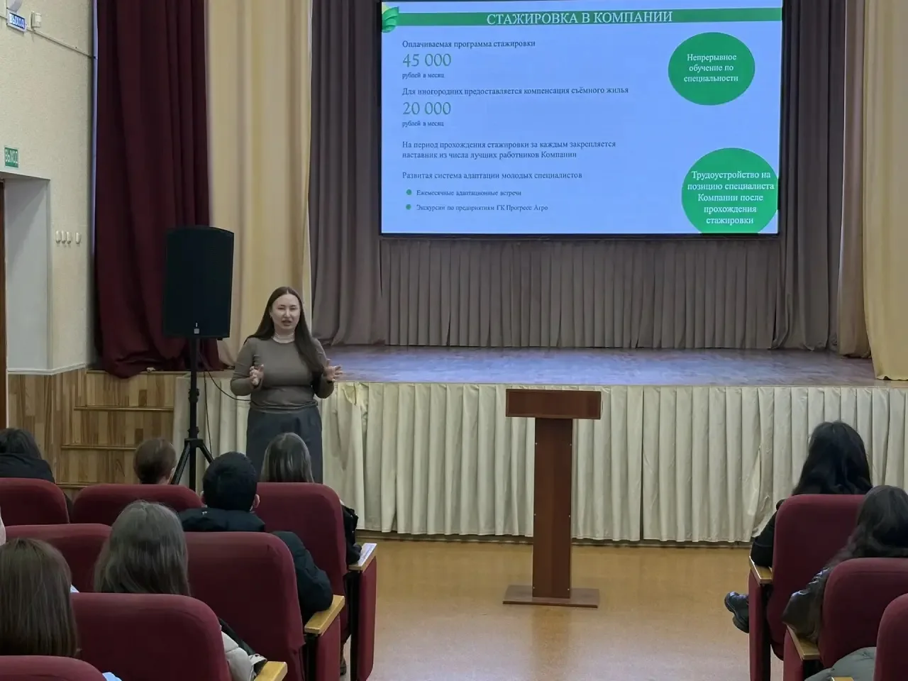 📋Представители ООО «Прогресс Агро» Новохатская П.А. и Бабешкина А.Ю. – специалисты отдела обучения персонала, рассказали обучающимся о своей компании, об имеющихся вакансиях, возможностях практической подготовки и прохождения стажировки, а также об условиях труда и бонусах, которые предусмотрены для работников предприятия. 🏭