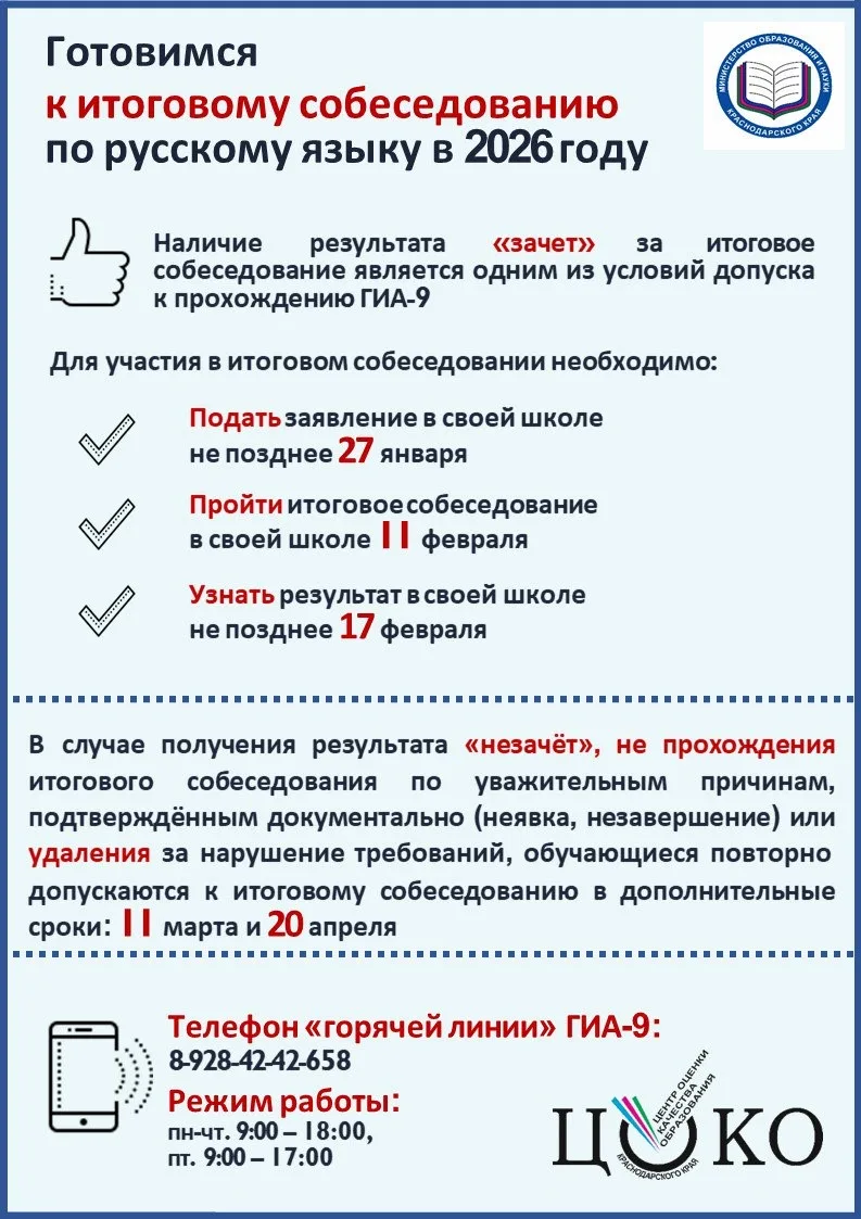 Напоминаем о сроке подачи заявления на участие в итоговом собеседовании по русскому языку 11 февраля 2026 года.