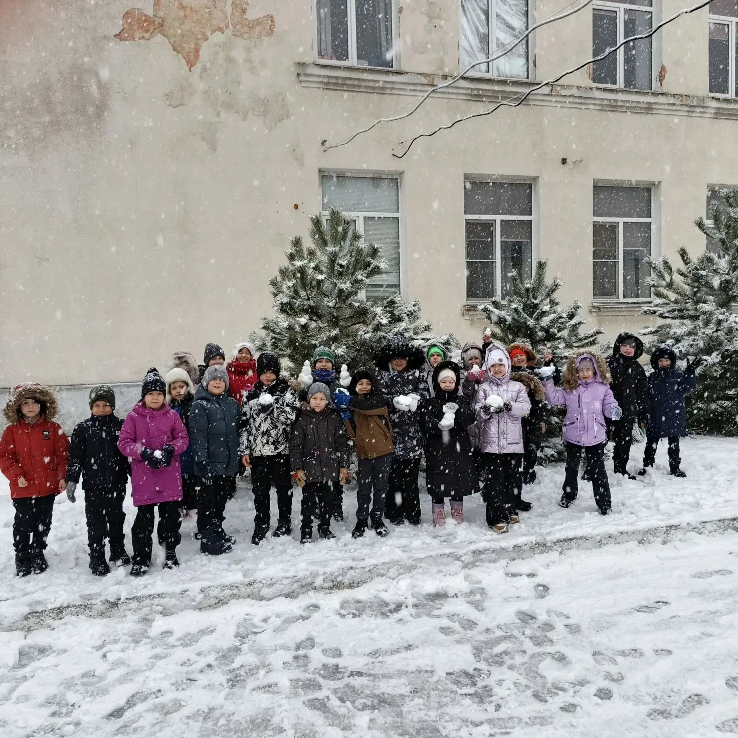 Школьный двор сегодня — эпицентр зимнего веселья. Дети в восторге, учителя улыбаются, снег летит во все стороны!