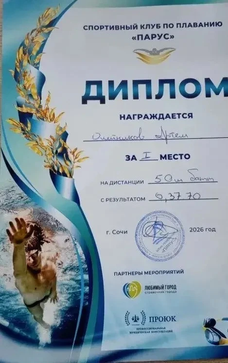 ✨Отличные новости! Хотим от всей души поздравить Артема Олейникова из 5 "Д" класса с заслуженной победой! Артем занял 1 место в соревнованиях по плаванию на дистанции 50 метров. Это результат упорных тренировок и настоящего спортивного духа! Молодец, Артем, так держать! 👏🏆