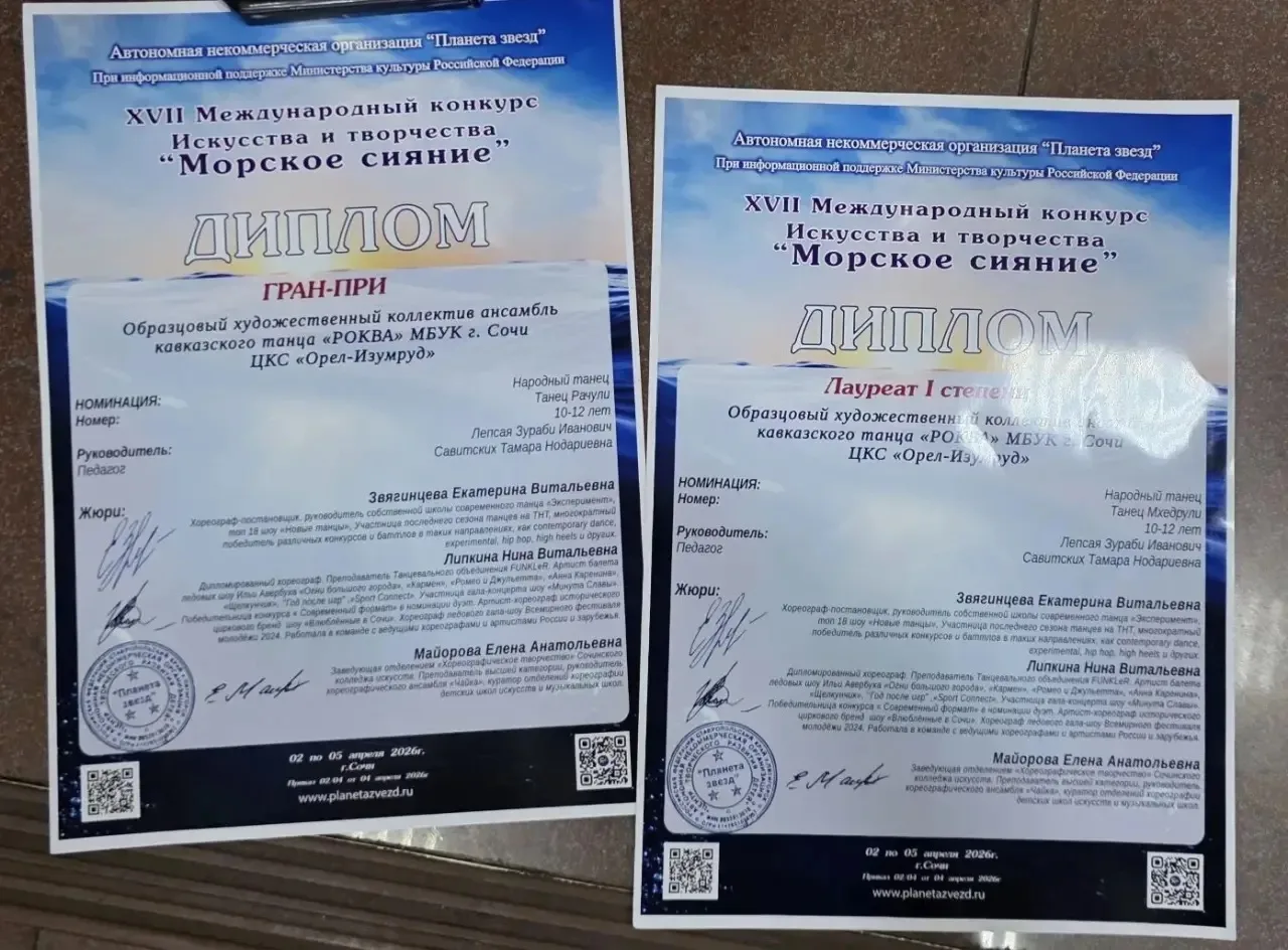 Большая победа на фестивале "Морское сияние" в Сочи! 🌊4 апреля в городе Сочи состоялся фестиваль искусства и творчества "Морское сияние". Ученицы 5 "Д" класса Абрамян Ариана и Папикян Анаида, в составе образцового хореографического ансамбля танцев народов Кавказа "РОКВА", стали настоящими триумфаторами!