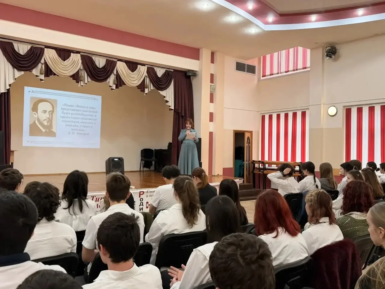 Сегодня ко дню Поэзии в нашей школе прошла увлекательная викторина по роману-эпопее Льва Толстого «Война и мир» среди 10-х классов. Мероприятие превратилось в настоящую интеллектуальную дуэль: командам предстояло соревноваться в знании образов персонажей, вспоминать тонкости характеров героев, их прототипов, любимые фразы и ключевые сцены из жизни Андрея Болконского, Пьера Безухова, Наташи Ростовой и многих других.