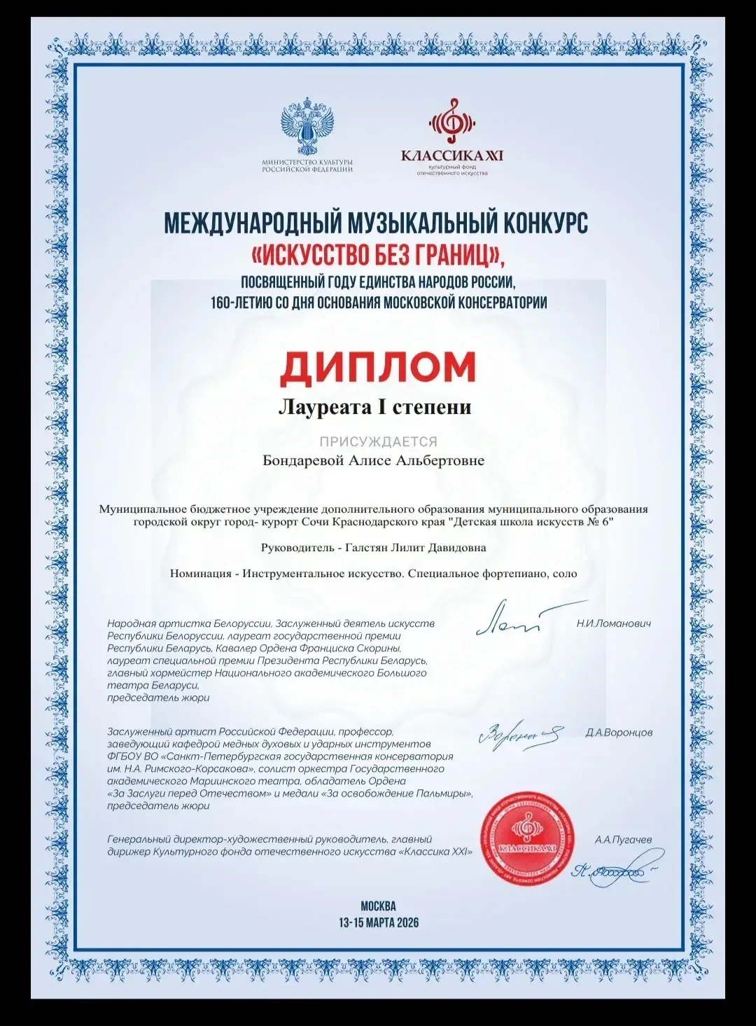 Алиса удостоена диплома Лауреата I степени 🥇в номинации «Инструментальное искусство. Специальное фортепиано (соло)»