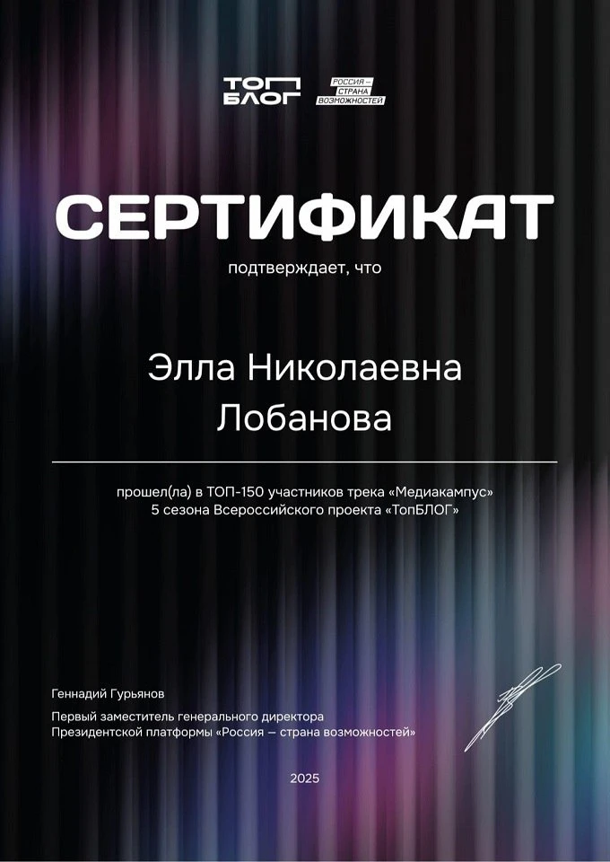 ✨Элла Николаевна успешно прошла в финал всероссийского образовательного проекта «ТопБЛОГ», организованного платформой «Россия – страна возможностей».