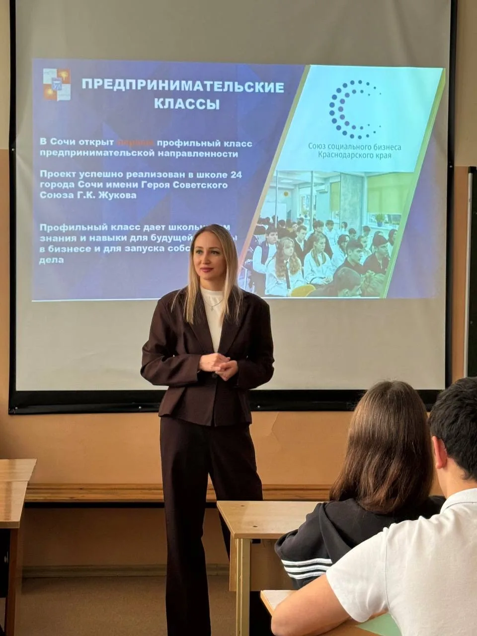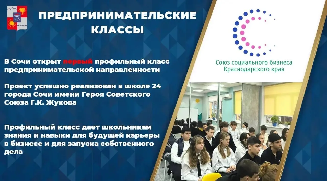 В рамках Стратегии социально-экономического развития муниципального образования городской округ город-курорт Сочи Краснодарского края, реализации программ профильного обучения школьников предпринимательской направленности, при поддержке Союза социального бизнеса Краснодарского края прошла встреча с учениками в первом и единственном в Сочи предпринимательском классе для учащихся 10-го класса МОБУ СОШ № 24 города Сочи имени Героя Советского Союза Г.К. Жукова.