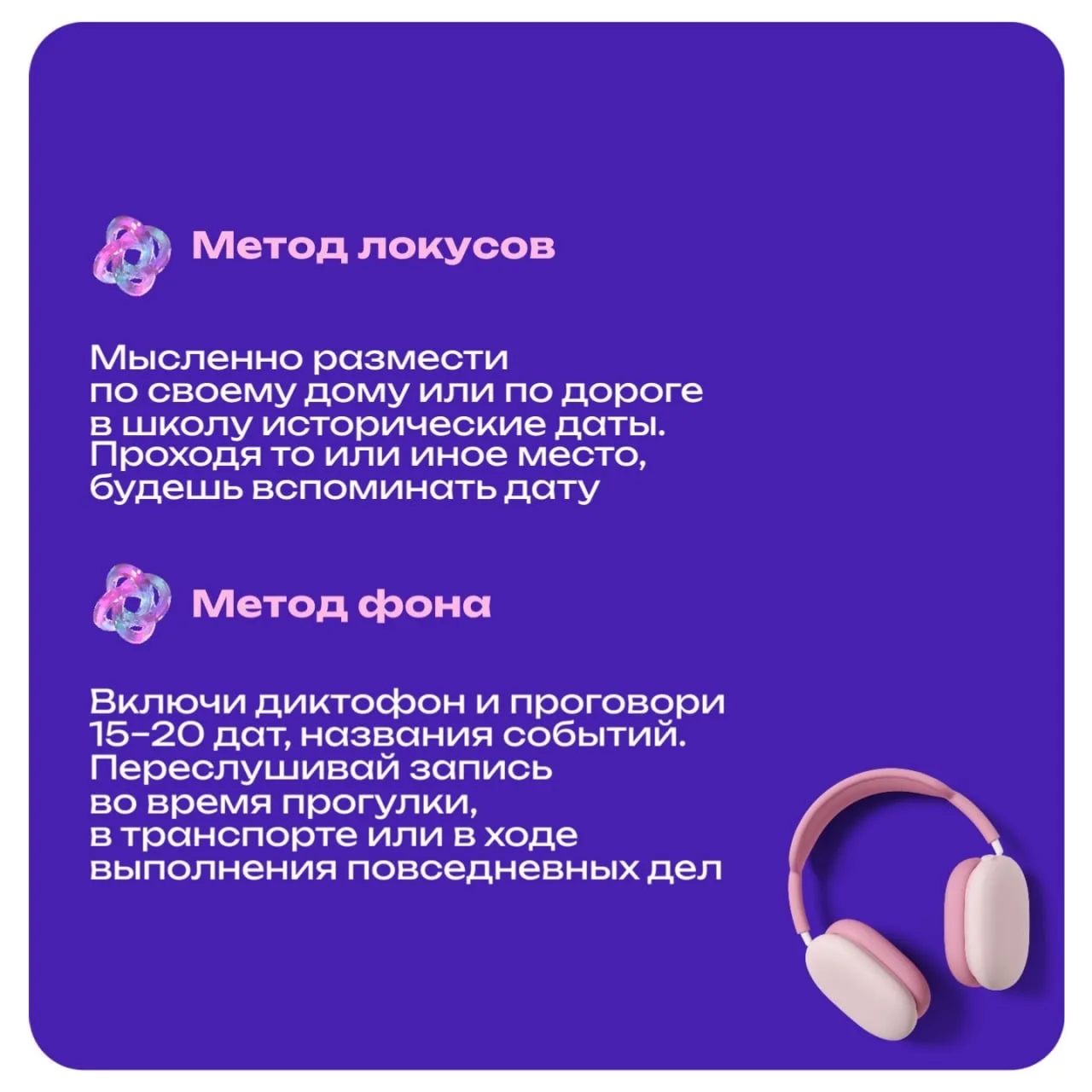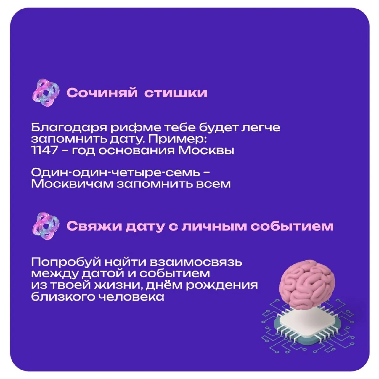 Есть разные техники запоминания, основанные на ассоциациях, визуализации и повторении. В карточках делимся полезными лайфхаками 💡
