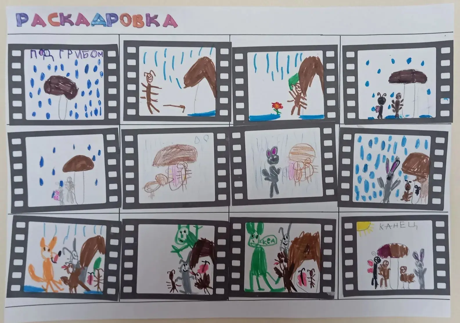 🍄Ребята создали свой первый мультфильм — «Под грибом». Работа шла поэтапно: сначала участники познакомились с произведением, затем приступили к раскадровке. В качестве техники анимации выбрали пластилиновую, а затем принялись за дело.