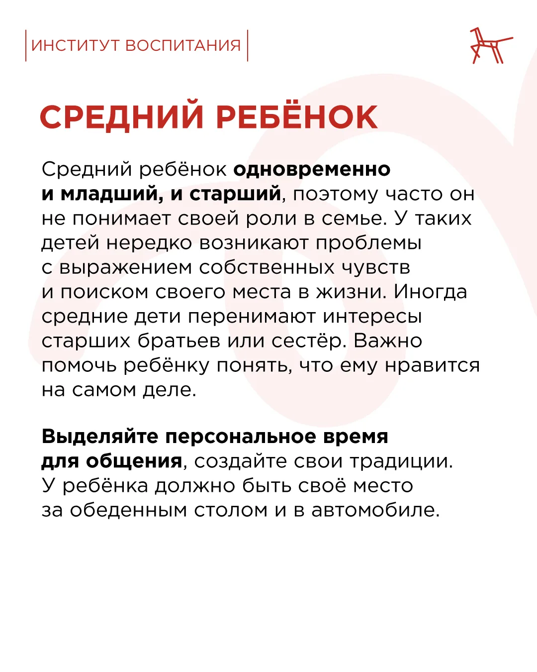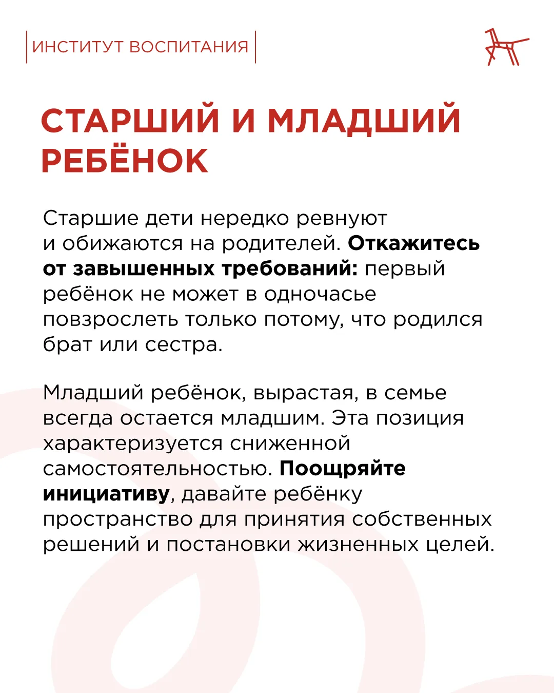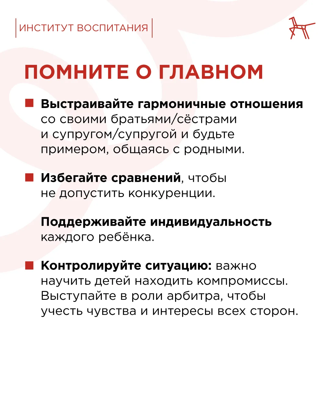 В карточках читайте о том, на что стоит обратить внимание при воспитании нескольких детей. Подробная статья о нюансах взаимоотношений братьев и сестёр на сайте журнала «Семья и школа».