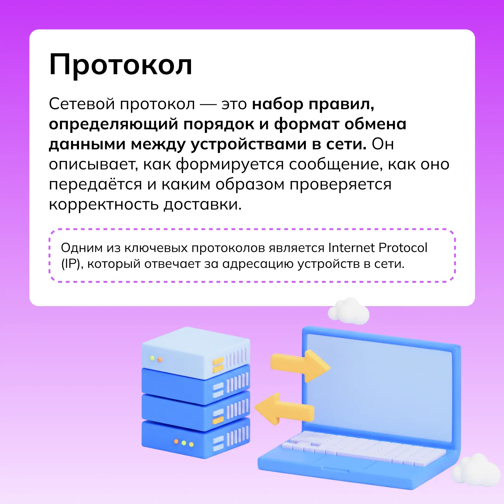 👨💻 Когда мы отправляем сообщение или открываем сайт, за доли секунды происходит целая цепочка технических процессов. Устройства находят друг друга в сети, обмениваются данными и получают информацию благодаря определённым технологиям.