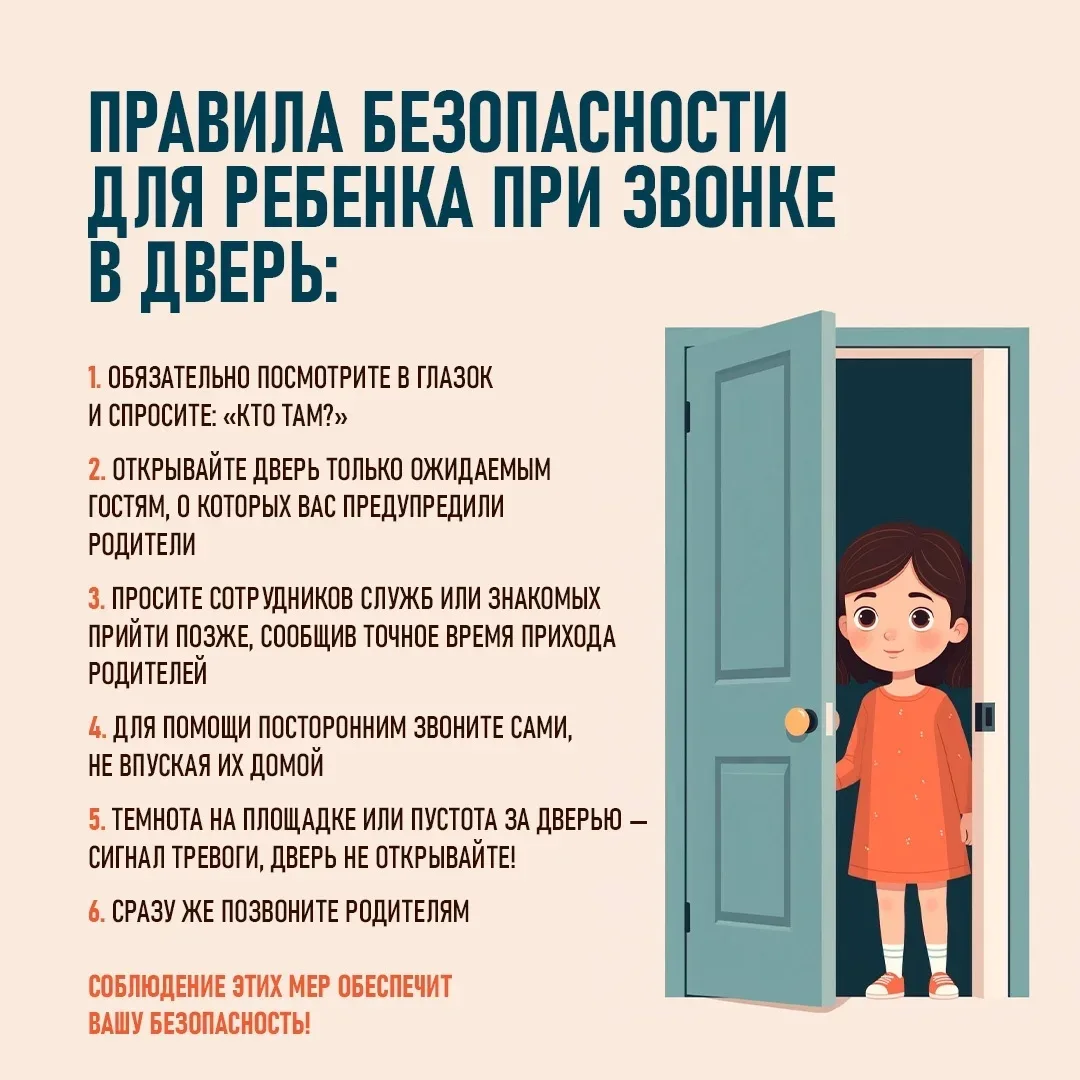 Сохраняйте памятку о правилах поведения ребёнка, оставшегося дома без взрослых, когда неожиданно раздается дверной звонок.